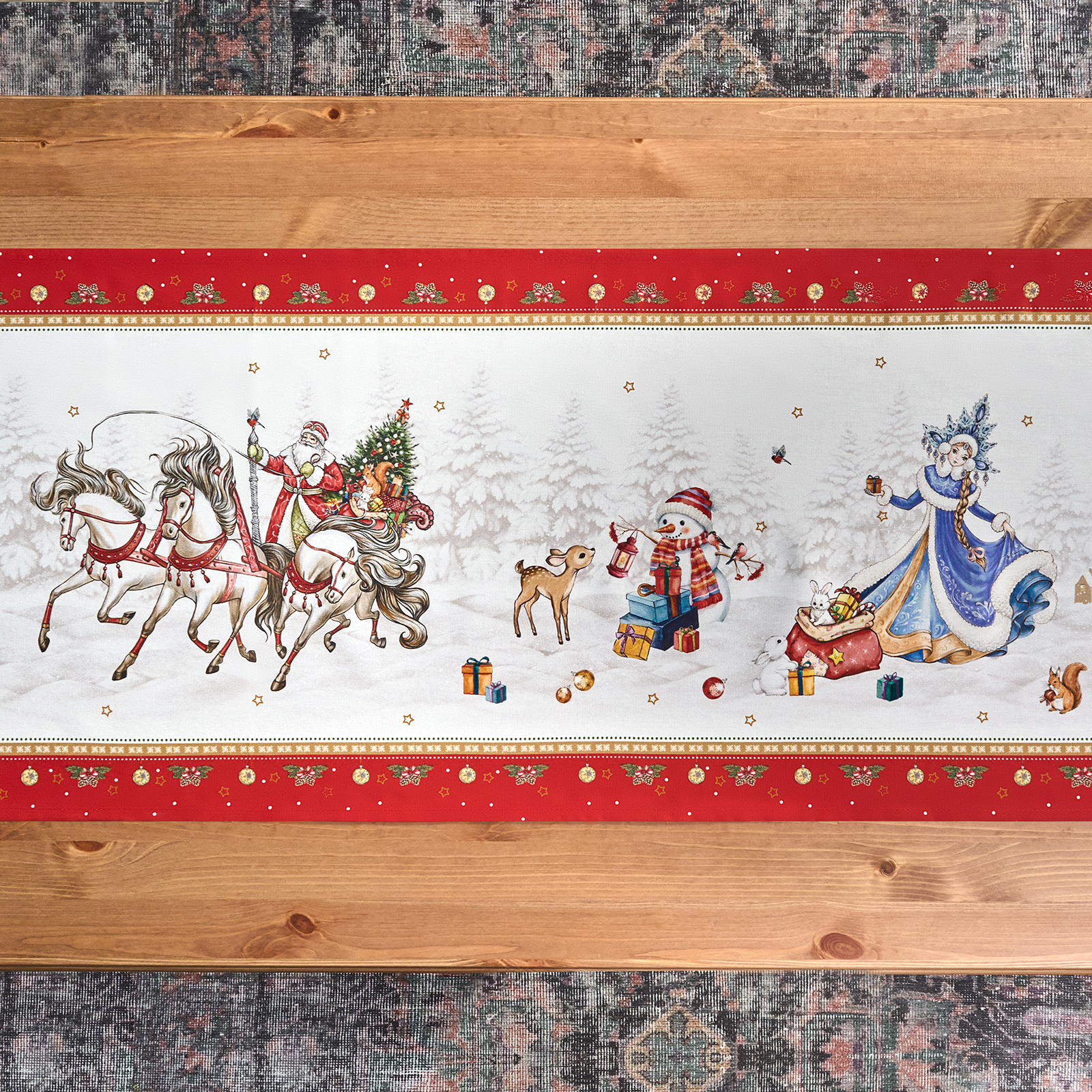 Хорошо комбинируется с однотонными скатертями, посудой в классическом или прованском стиле, текстилем в зимней палитре. Подходит для дома, дачи, загородного коттеджа. Размер 45×300 см идеально подойдёт для прямоугольных и овальных столов, позволяя создать аккуратный и завершённый образ сервировки.