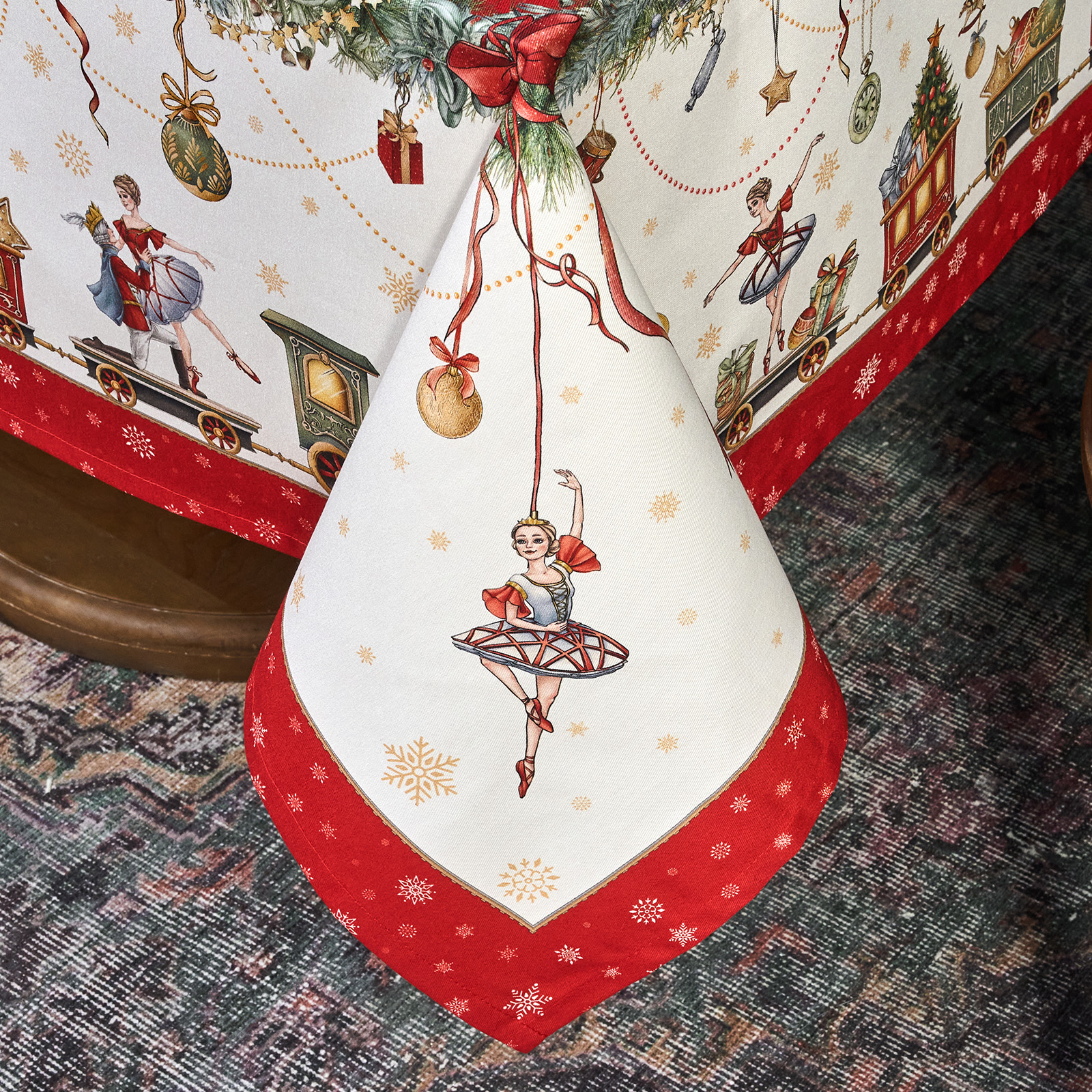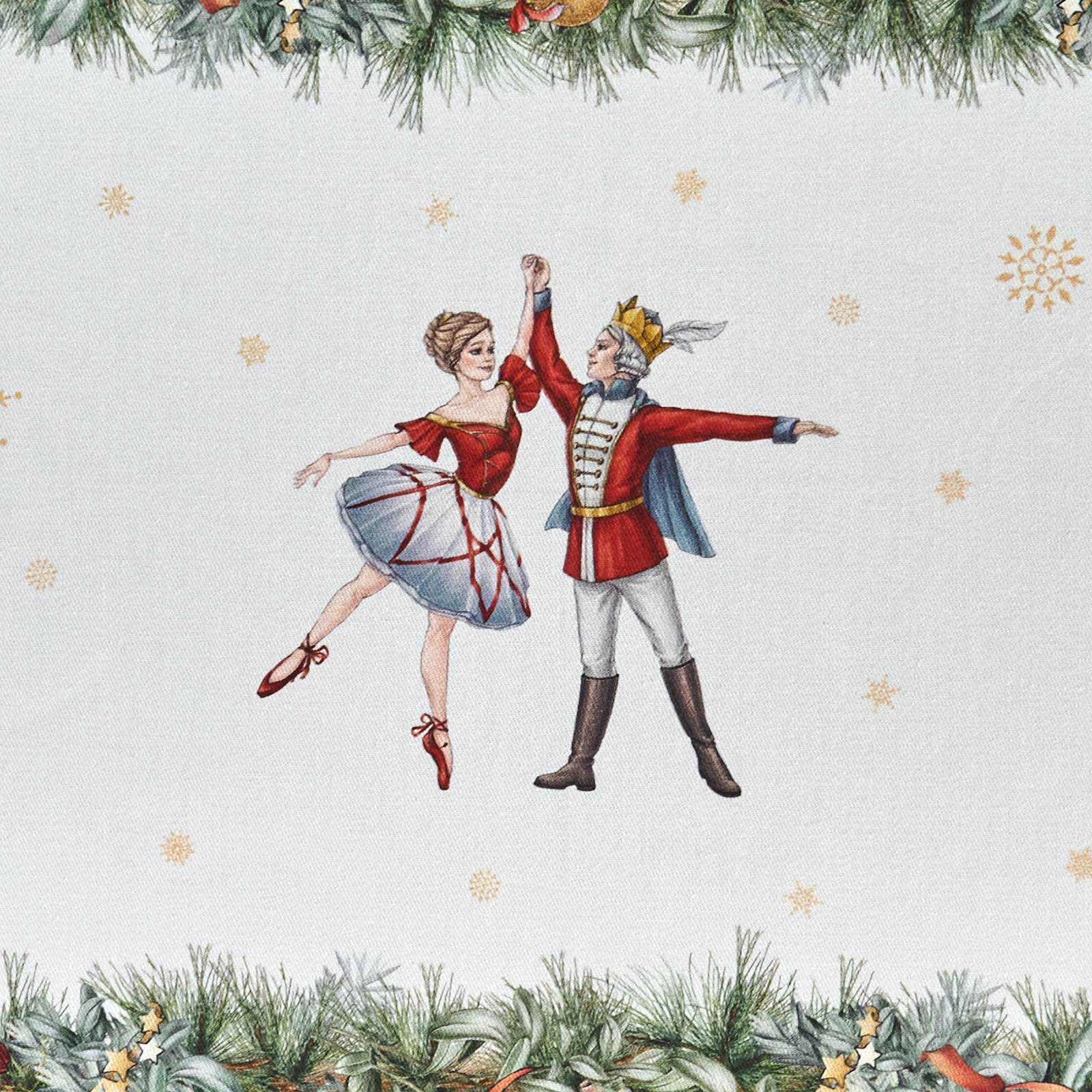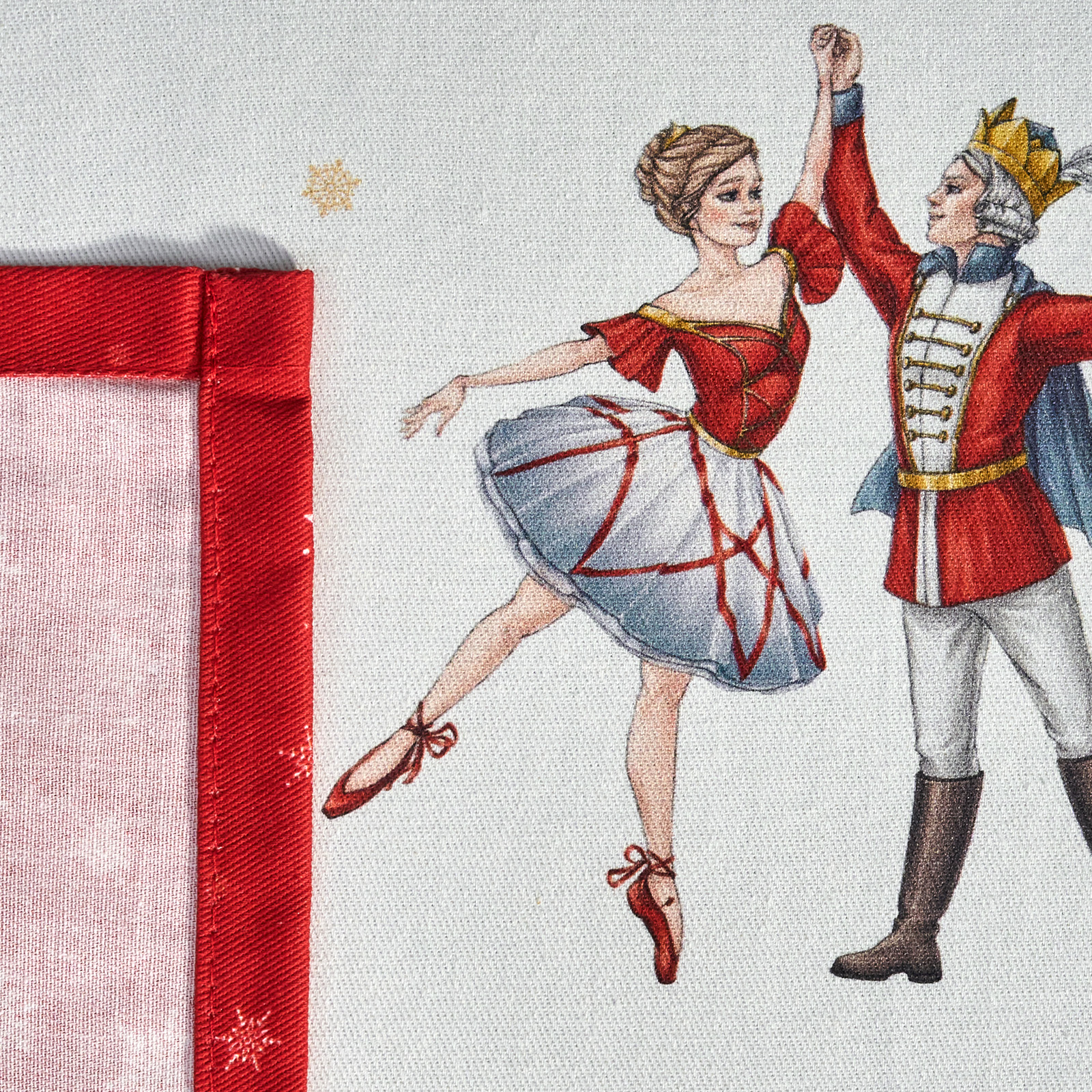 Созданная по эксклюзивному дизайну, она передаёт волшебство рождественской сказки: на ткани словно оживают сцены из любимого балета — яркие игрушки, подарки, веточки ели и персонажи, воплощающие дух праздника.