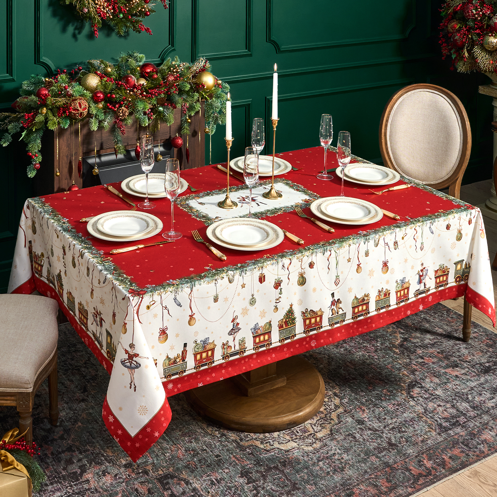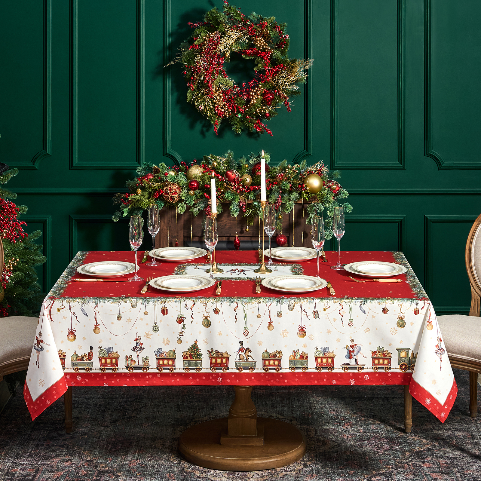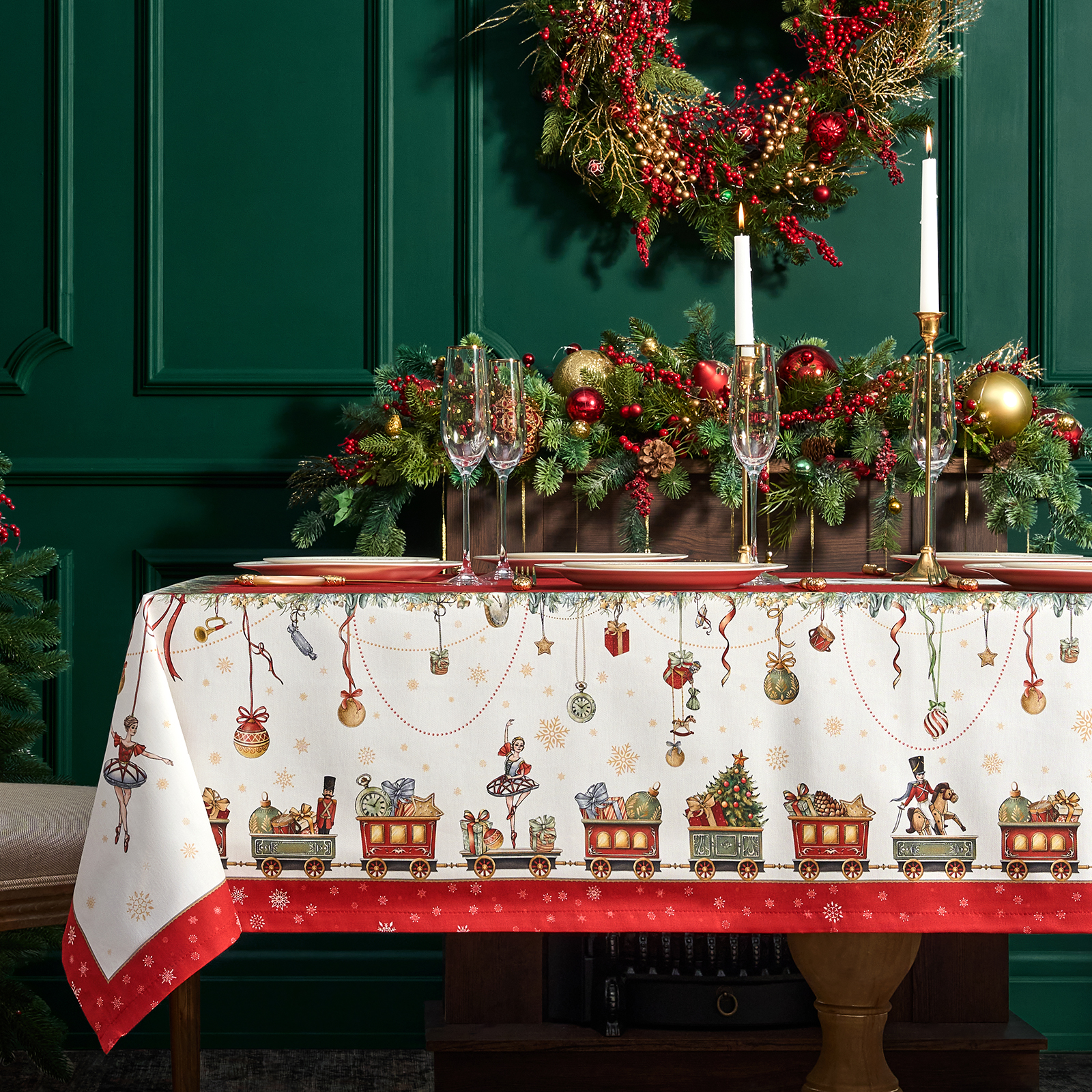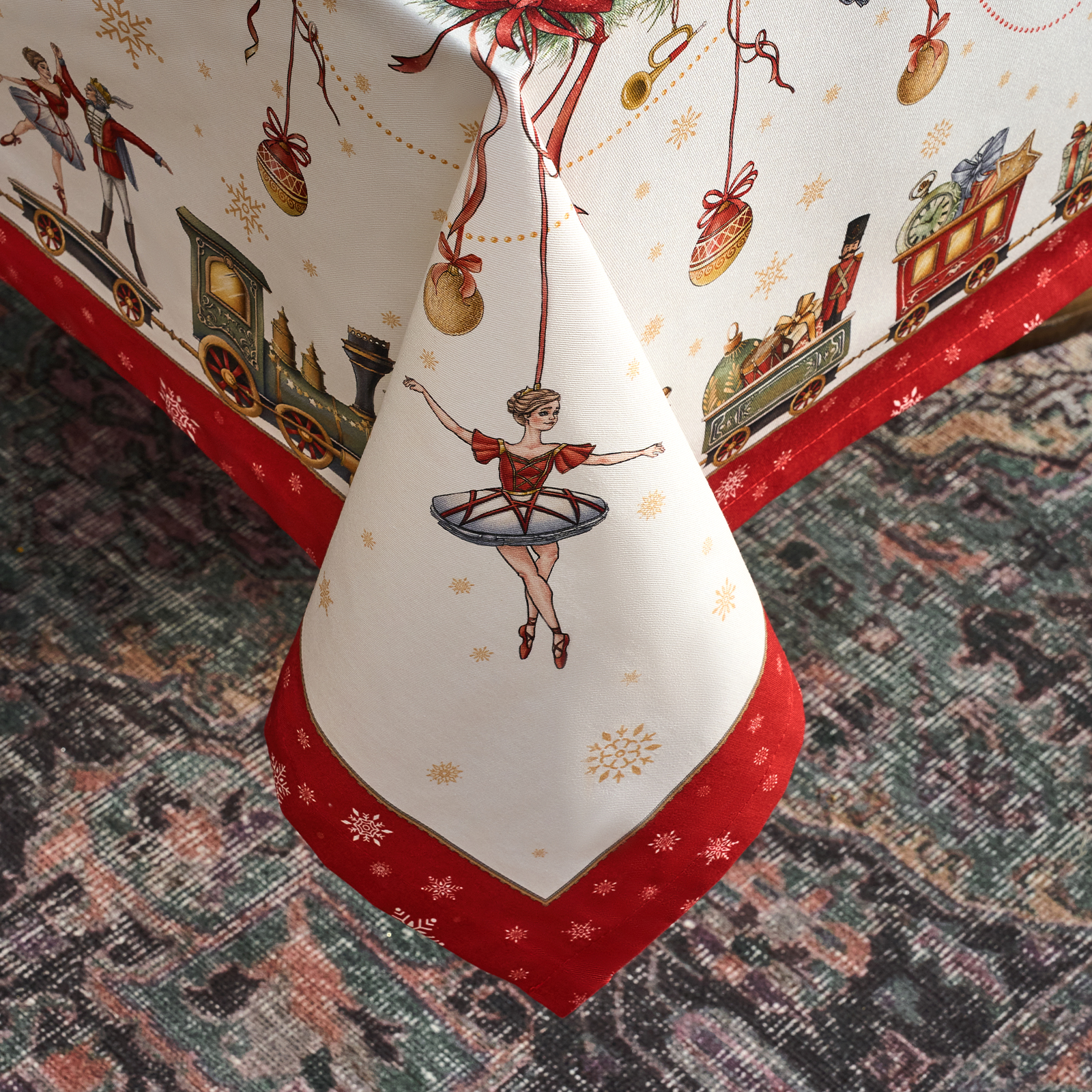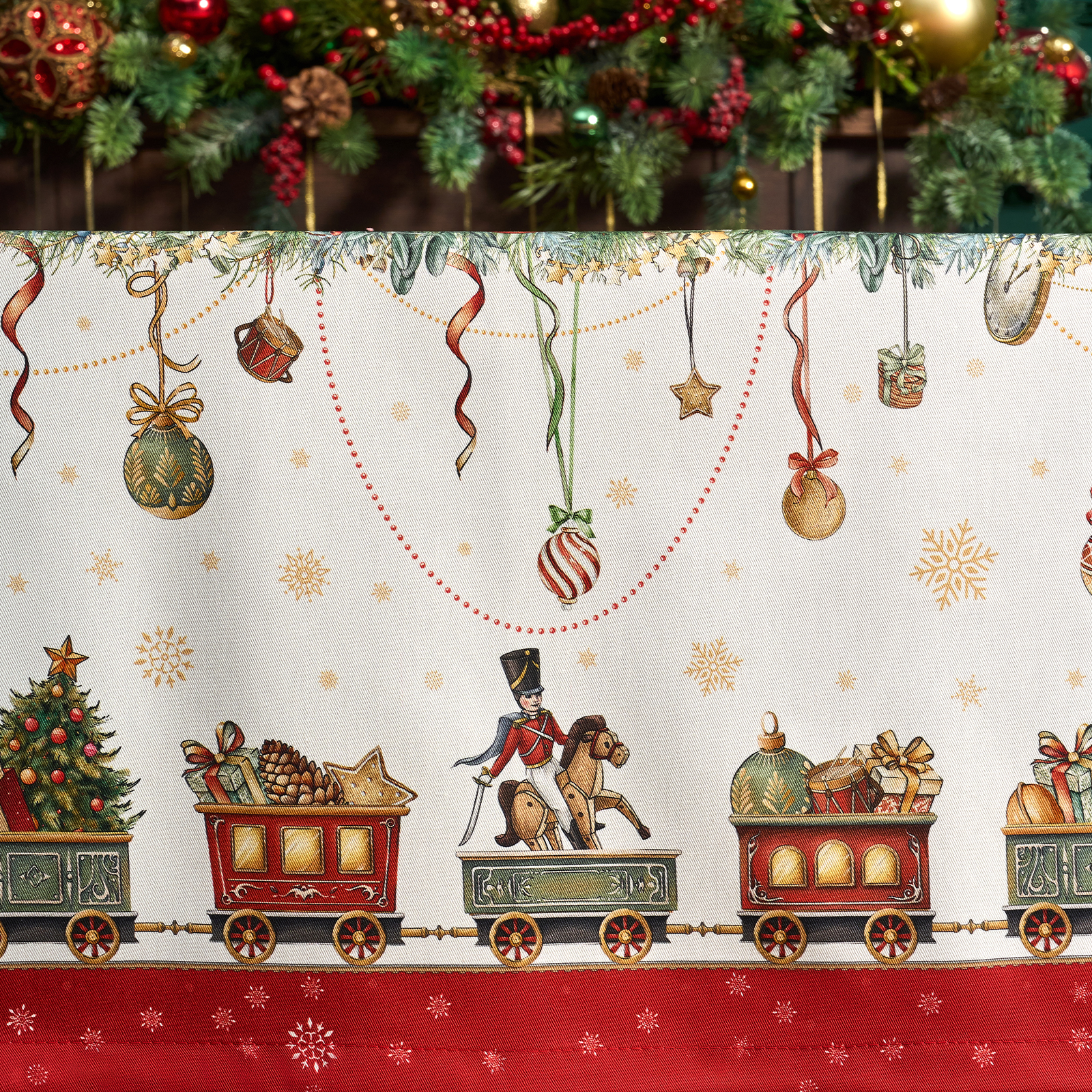 Скатерть создана по эксклюзивному дизайну для бренда Lefard и гармонирует с одноимённой посудой из коллекции Щелкунчик. Это текстиль высокого класса, который подойдёт как для домашнего использования, так и в качестве подарка.