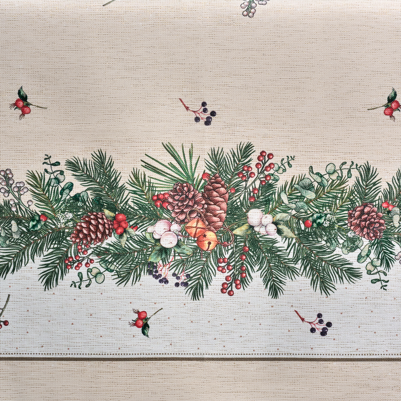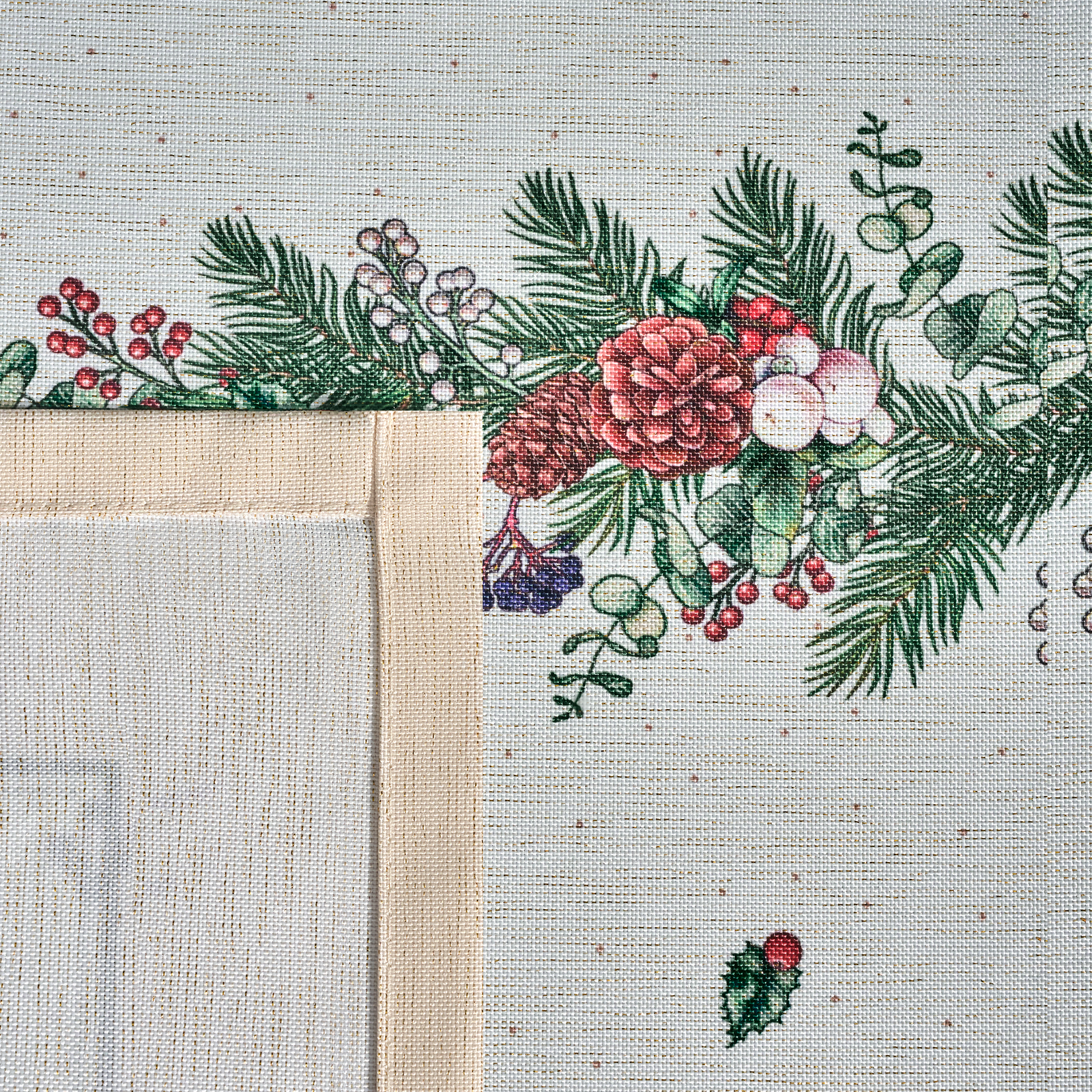 Принт вдохновлён мотивами зимнего леса: еловая зелень, алые ягоды и шишки образуют композицию, напоминающую рождественский венок. Рисунок передаёт свежесть зимнего утра и наполняет интерьер праздничным настроением.
