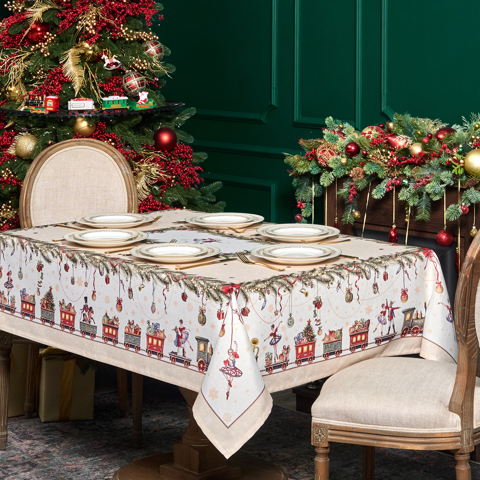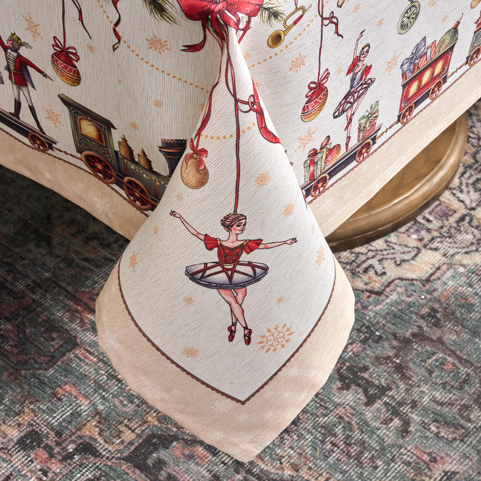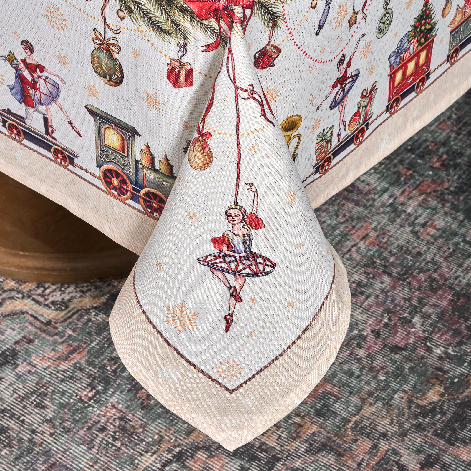 Принт переносит в волшебную историю Щелкунчика: в центре балерина и принц в танце, а по краю оживает рождественский мир — игрушки, фонарики и миниатюрная железная дорога. Эта скатерть словно кадр из сказки — наполняет дом теплом, уютом и ожиданием чуда.