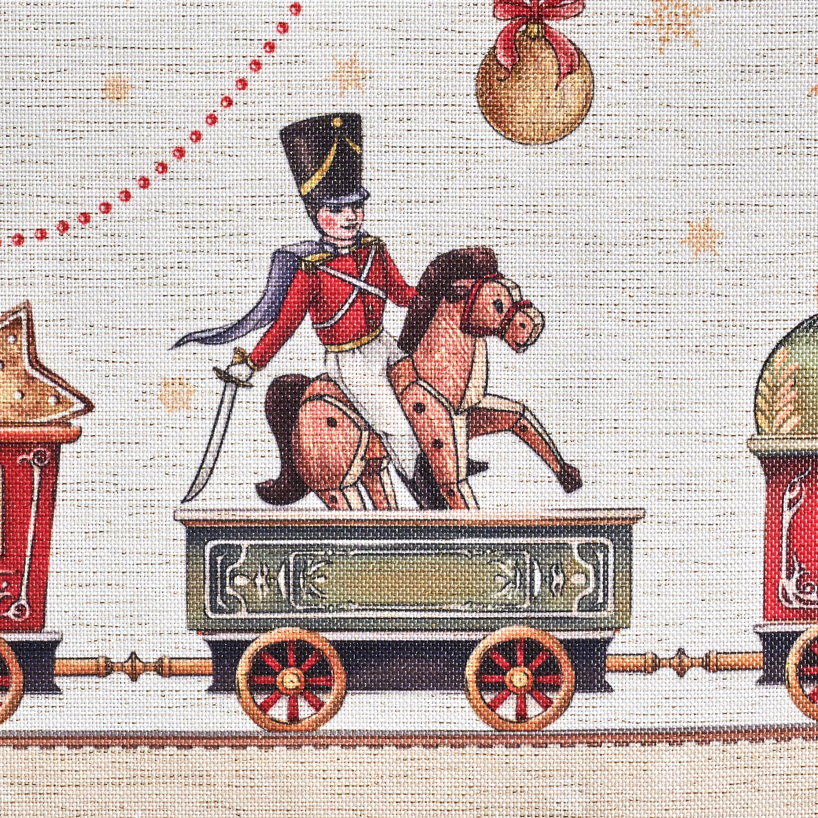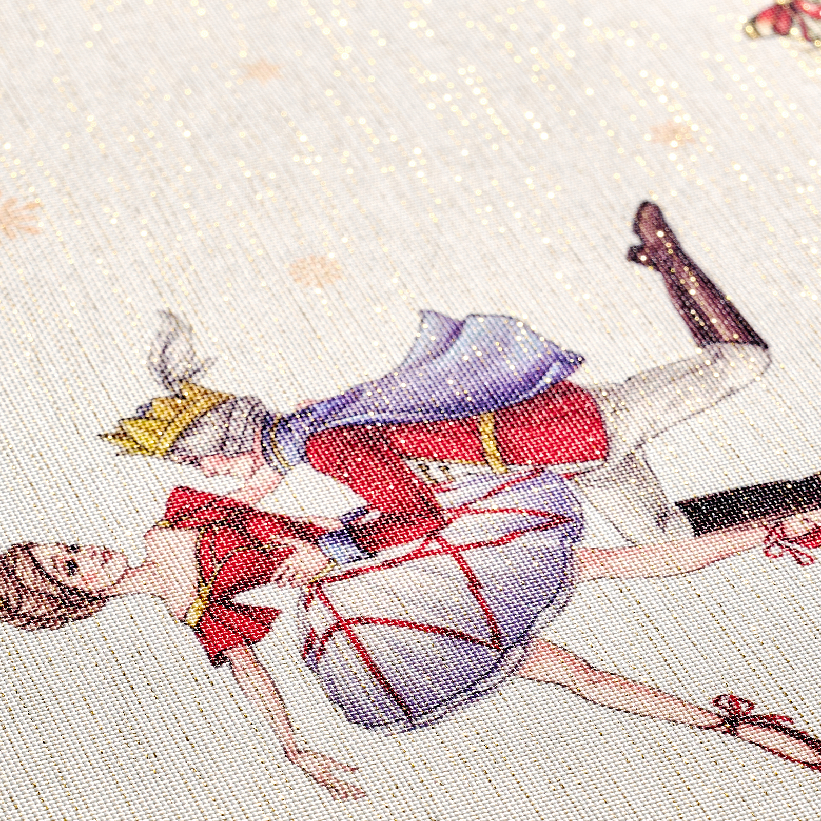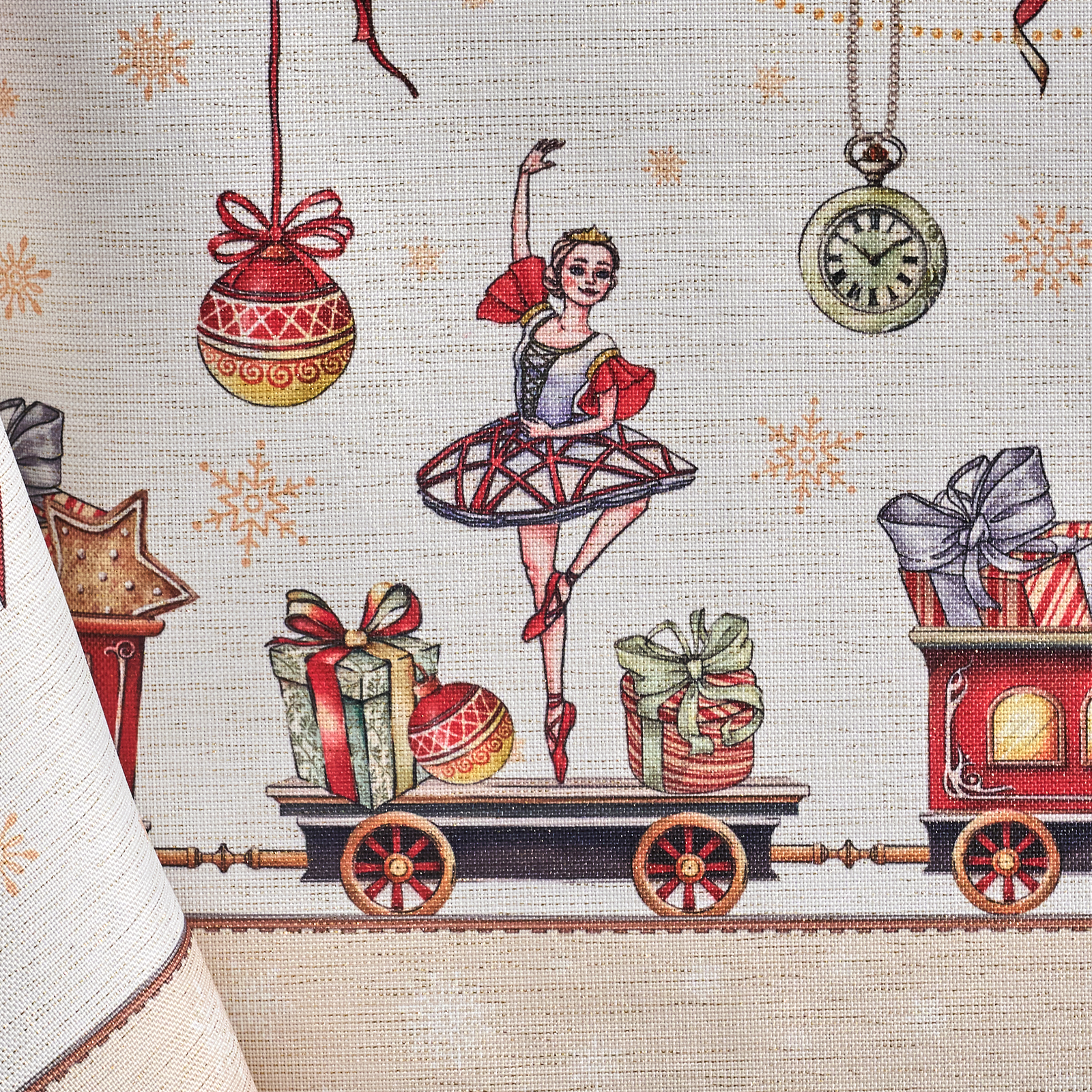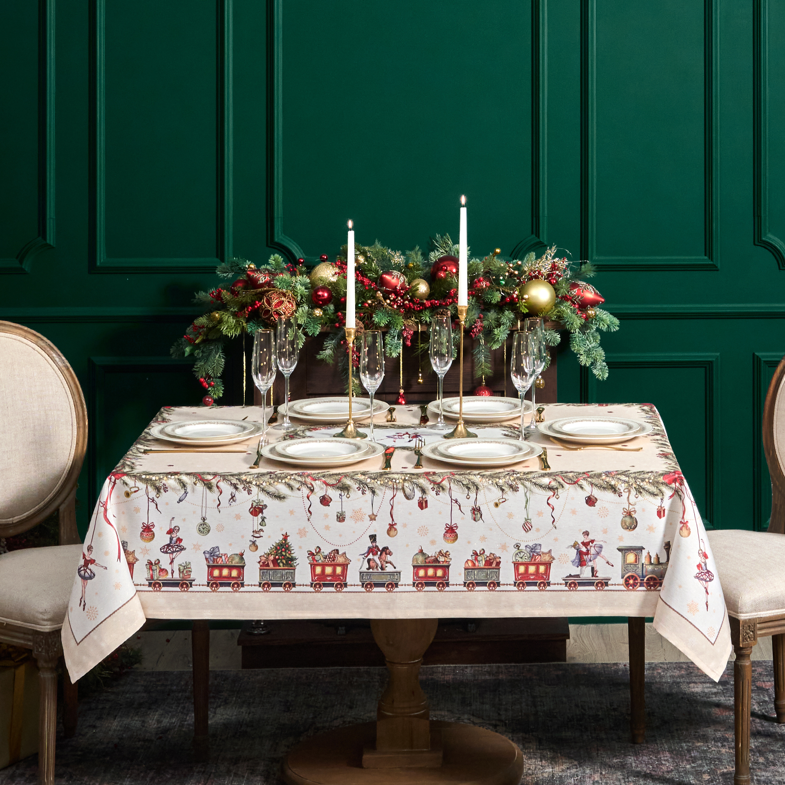 Принт переносит в волшебную историю Щелкунчика: в центре балерина и принц в танце, а по краю оживает рождественский мир — игрушки, фонарики и миниатюрная железная дорога. Эта скатерть словно кадр из сказки — наполняет дом теплом, уютом и ожиданием чуда.