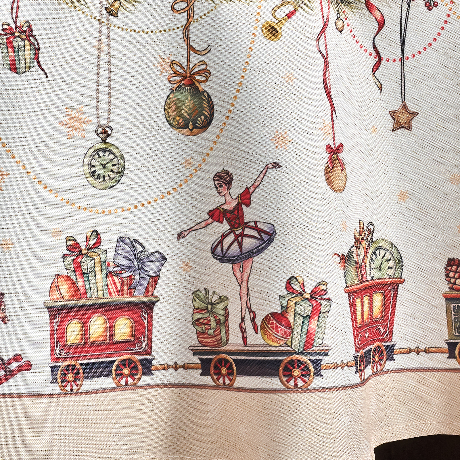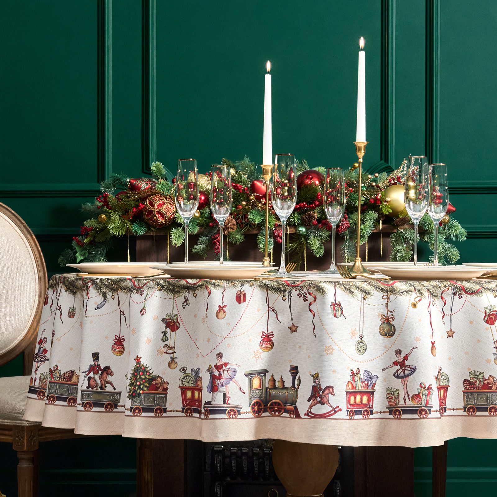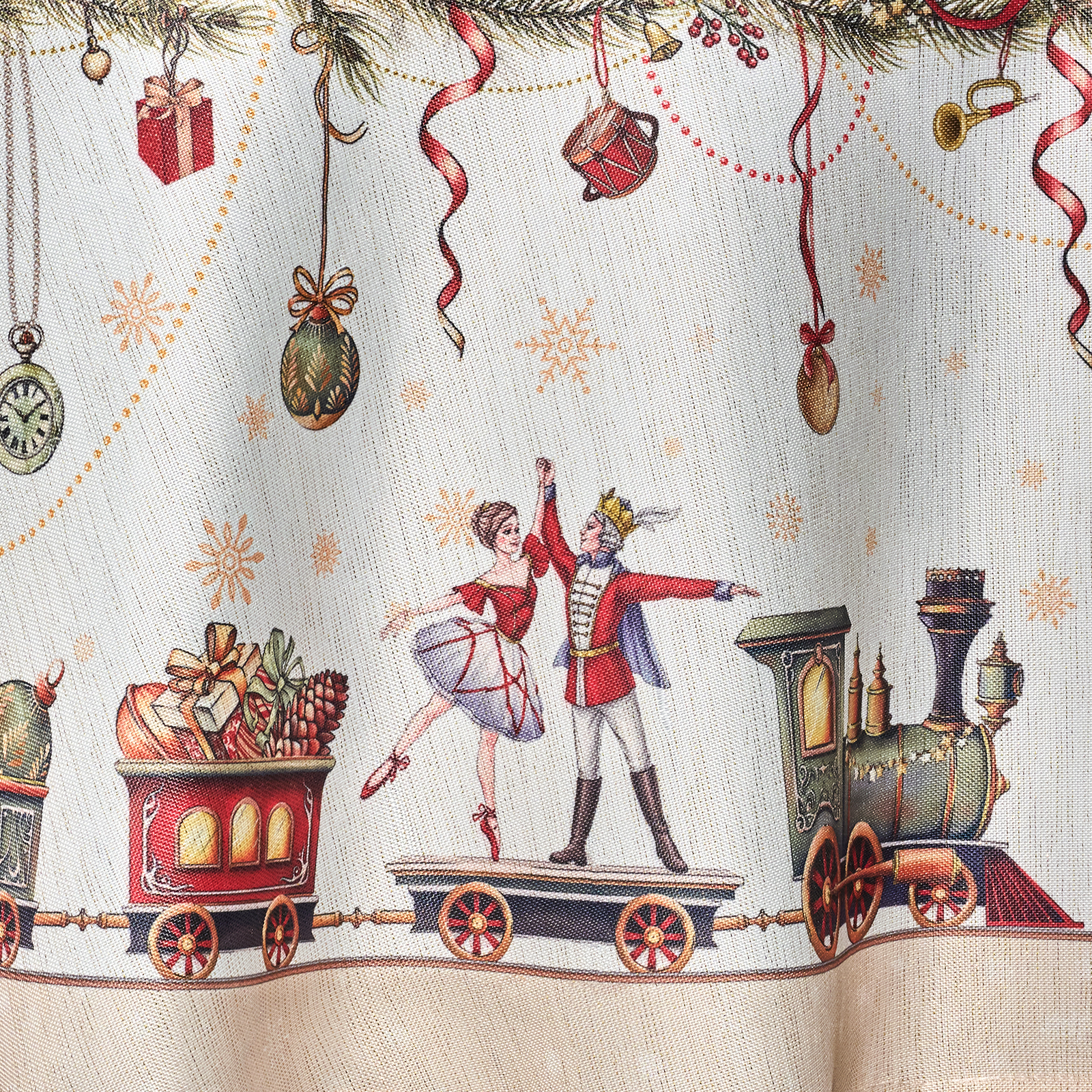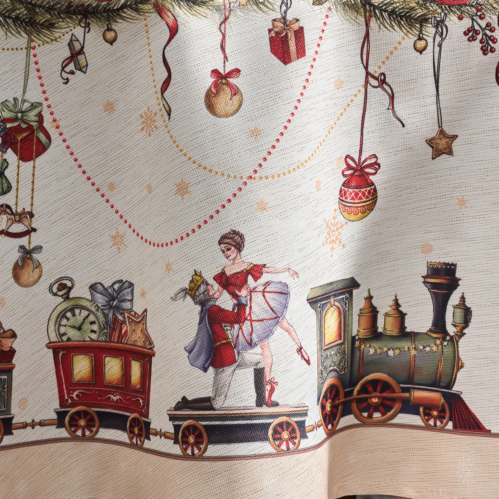 Принт вдохновлён знаменитой сказкой «Щелкунчик» в центре балерина и принц, а по краю оживает рождественская композиция — игрушки, еловые ветви, гирлянды и миниатюрная железная дорога. Эта скатерть словно сцена из новогоднего спектакля — наполняет дом теплом, уютом и ожиданием чуда.