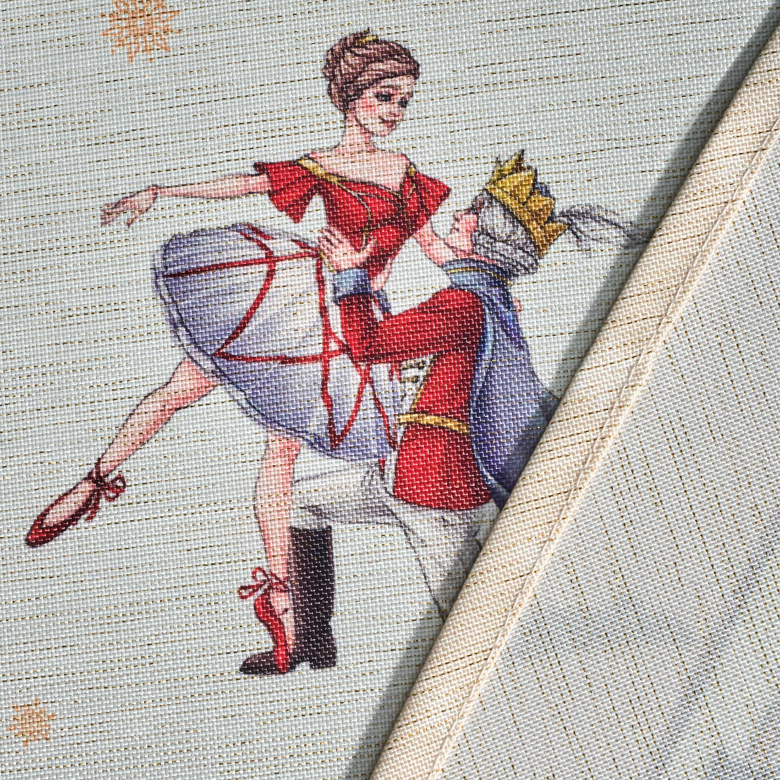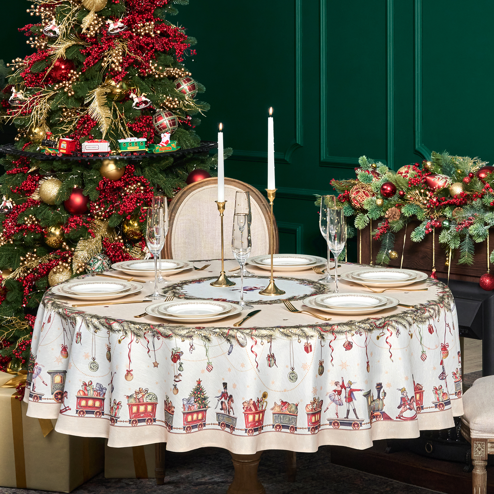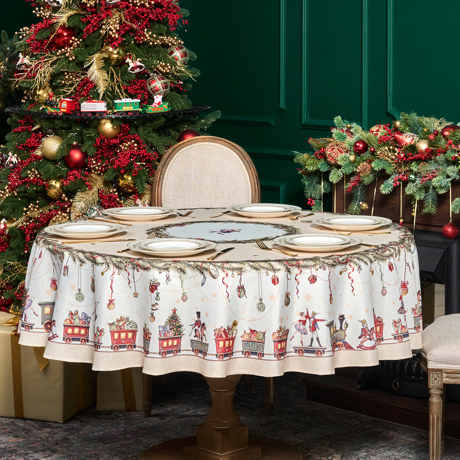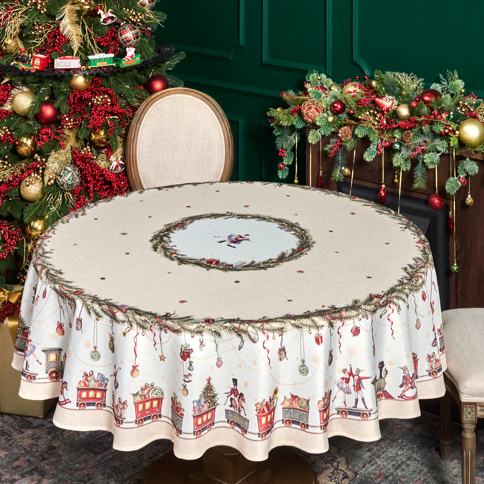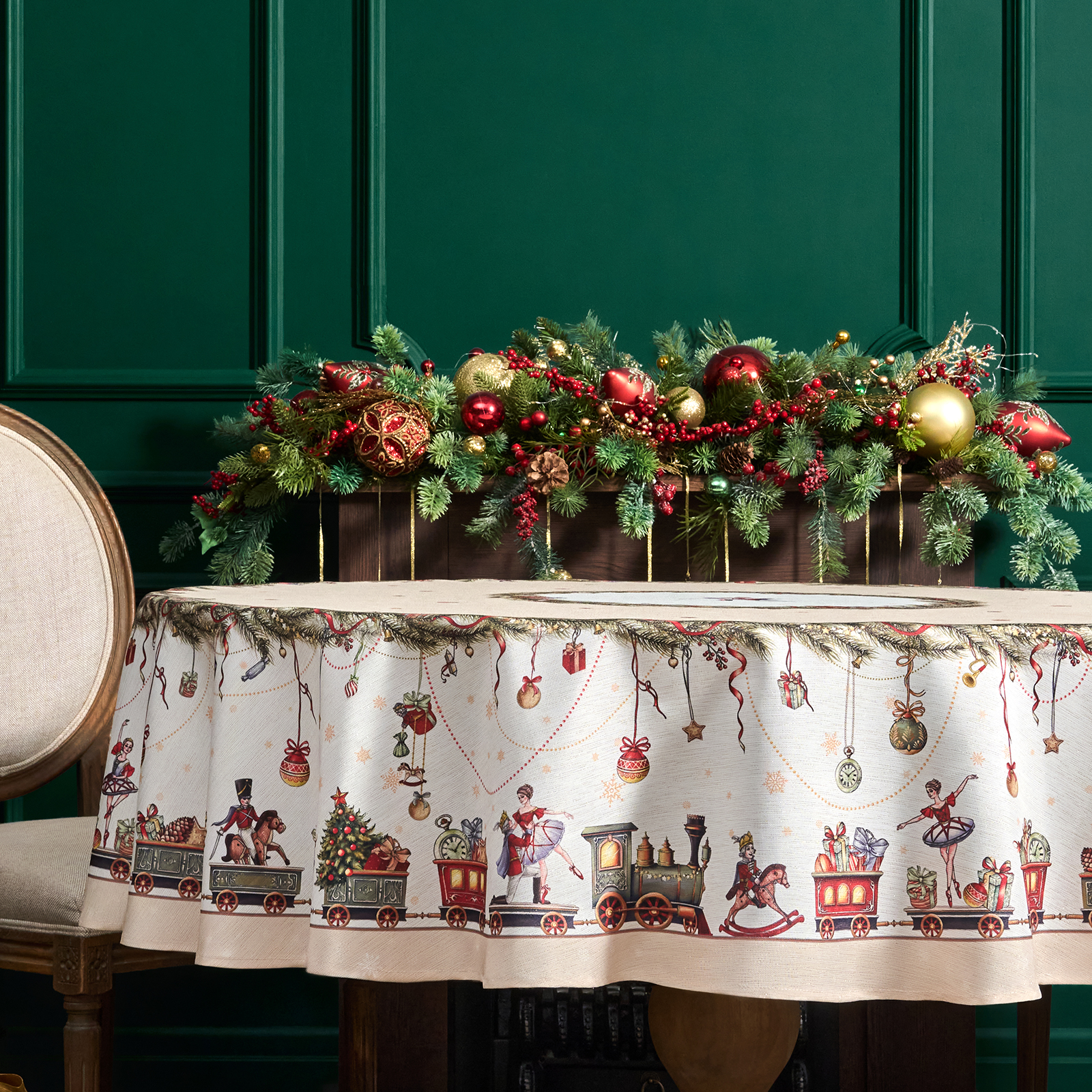 Принт вдохновлён знаменитой сказкой «Щелкунчик» в центре балерина и принц, а по краю оживает рождественская композиция — игрушки, еловые ветви, гирлянды и миниатюрная железная дорога. Эта скатерть словно сцена из новогоднего спектакля — наполняет дом теплом, уютом и ожиданием чуда.