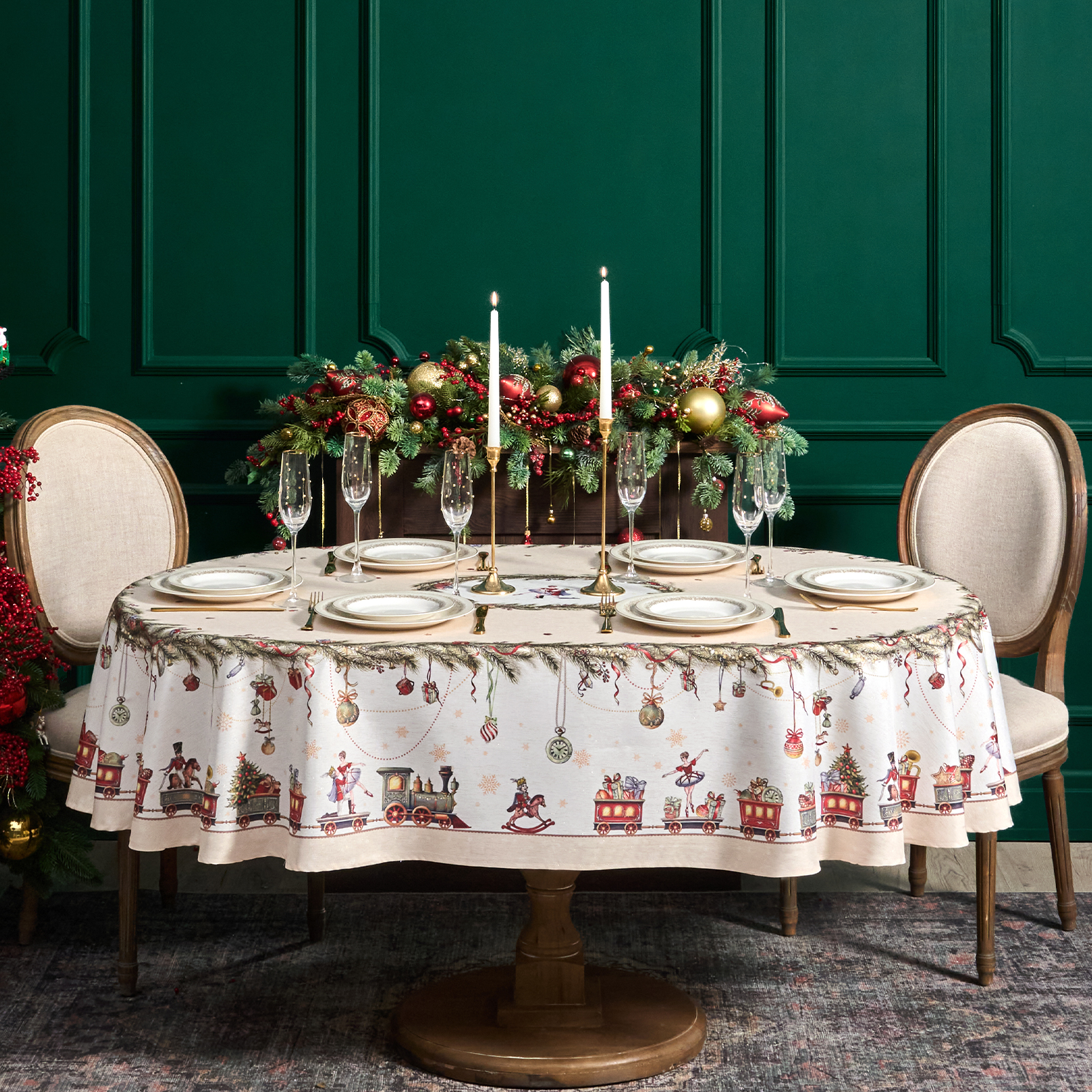 Принт переносит нас в волшебную историю Щелкунчика: в центре балерина и принц в танце, а по краю оживает рождественский мир — игрушки, фонарики и миниатюрная железная дорога. Эта скатерть словно кадр из сказки — наполняет дом теплом, уютом и ожиданием чуда.