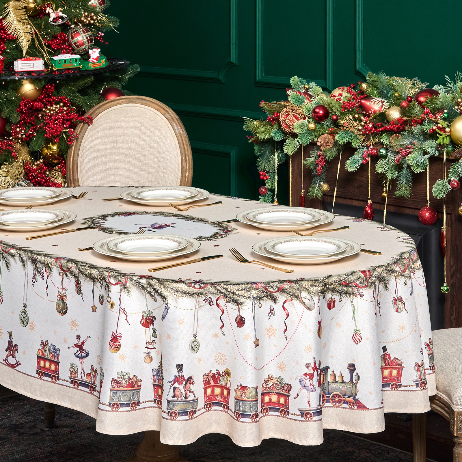 Новогодняя овальная скатерть Lefard из коллекции «Щелкунчик» — изысканное украшение для сервировки большого праздничного стола.