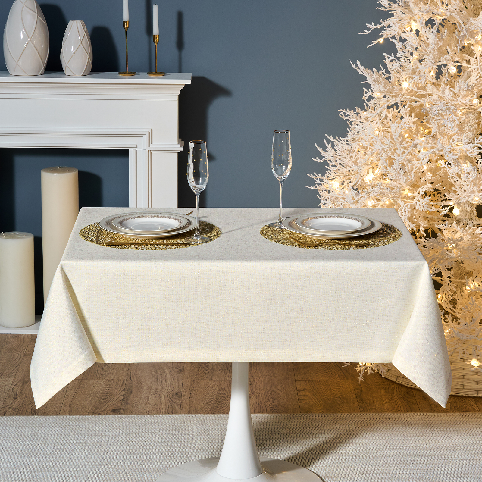 Благородный золотой оттенок придаёт сервировке изысканность и лёгкое мерцание. Однотонная ткань с нитью люрекса красиво переливается при свете ламп и свечей, создавая мягкое сияние и визуальную глубину. Скатерть гармонично сочетается с посудой и аксессуарами Lefard, помогая оформить новогодний декор в едином стиле. Её сдержанное сияние превращает каждый ужин в настоящий праздничный ритуал.