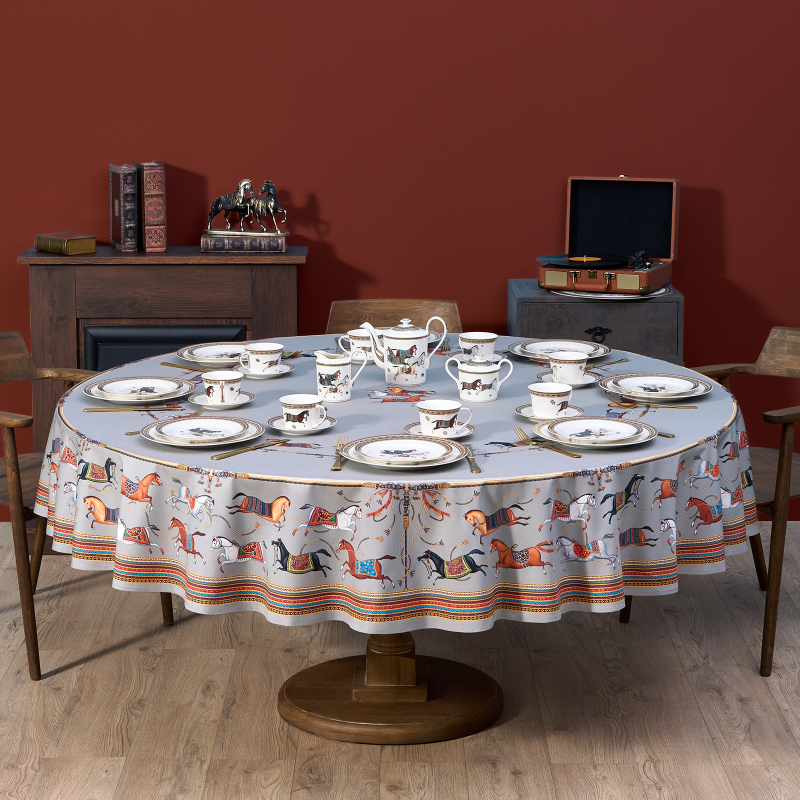 Фон украшен авторским орнаментом с изящными лошадьми — символом 2026 года. Такой принт делает скатерть особенно уместной для праздничной сервировки и стильным украшением интерьера. Рисунок разработан художниками Lefard и нанесён методом цифровой печати, что обеспечивает стойкость красок даже после множества стирок.
