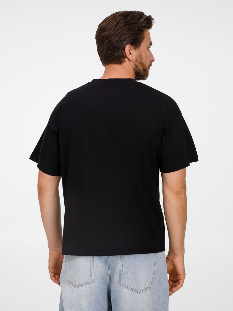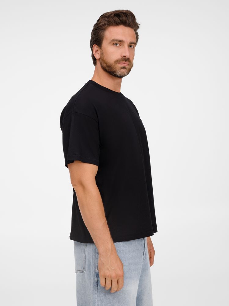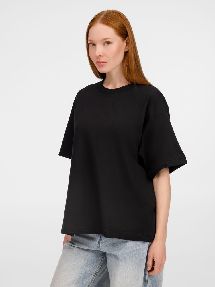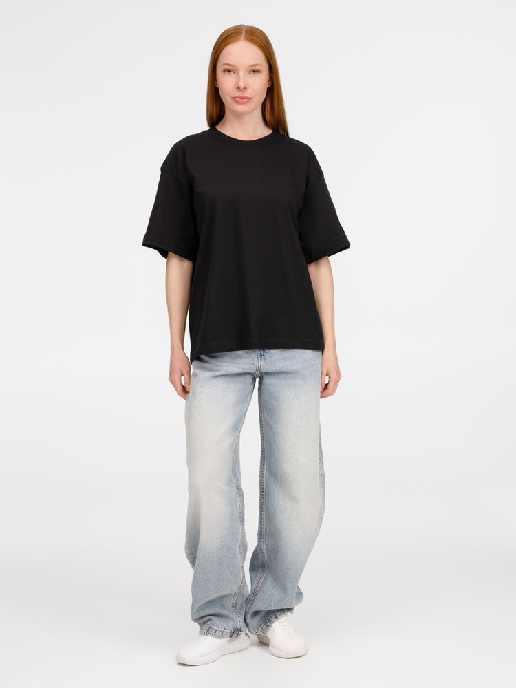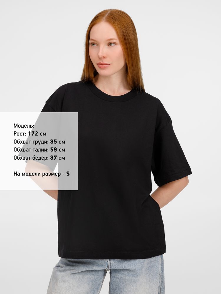 Футболка оверсайз унисекс с круглым вырезом и без боковых швов. Выполнена из смеси переработанного и обычного хлопка. Благодаря повышенной плотности отлично держит форму.