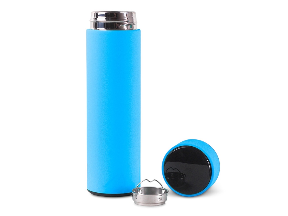 Термос из нержавеющей стали, покрытый цветным soft touch, с крышкой, в которой встроен термометр и LED дисплей, показывающий температуру внутри термоса. Объем: 500 мл. Упаковка: каждый термос в крафт коробке.