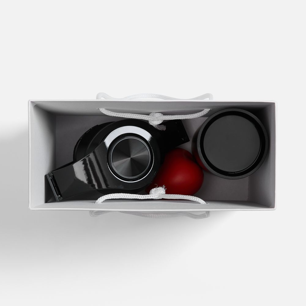 | Материал | наушники - пластик; термостакан - нержавеющая сталь, матовое покрытие; крышка - пластик, силикон; коробка - переплетный картон, бумага Magic; антистресс - вспененный полиуретан |