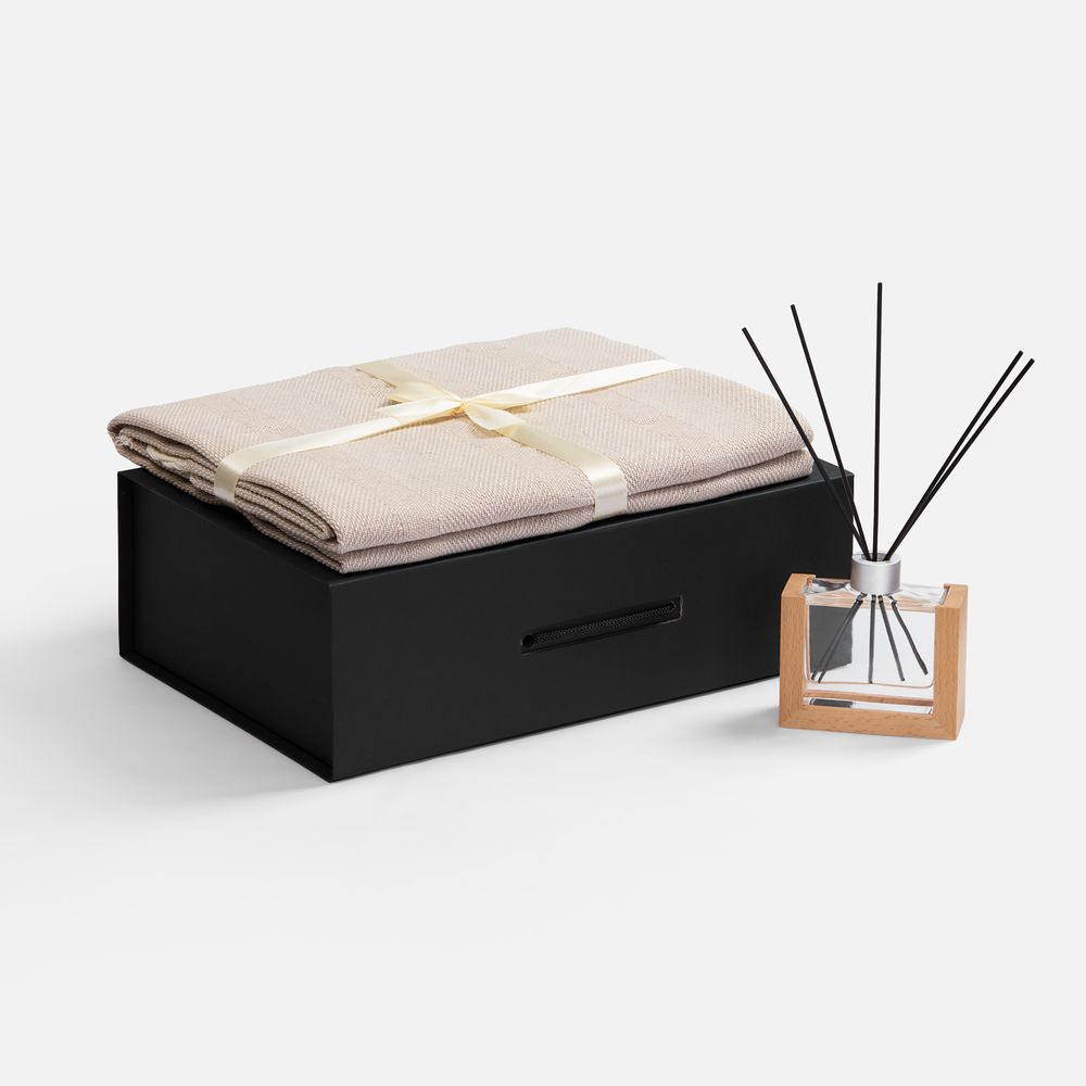 | Материал | флакон - стекло, палочки из файбера; подставка для флакона - дерево; плед - хлопок 95%, полиэстер 5%, плотность 300 г/м²; коробка - переплетный картон, бумага Malmero |