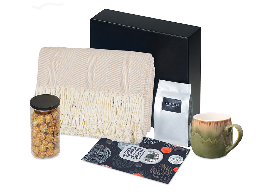 | Материал | плед - 100% хлопок, кружка - костяной фарфор с покрытием soft-touch,чай - пластик, попкорн - пластик, металл, мешок - нетканый материал (спандонд), коробка - картон |