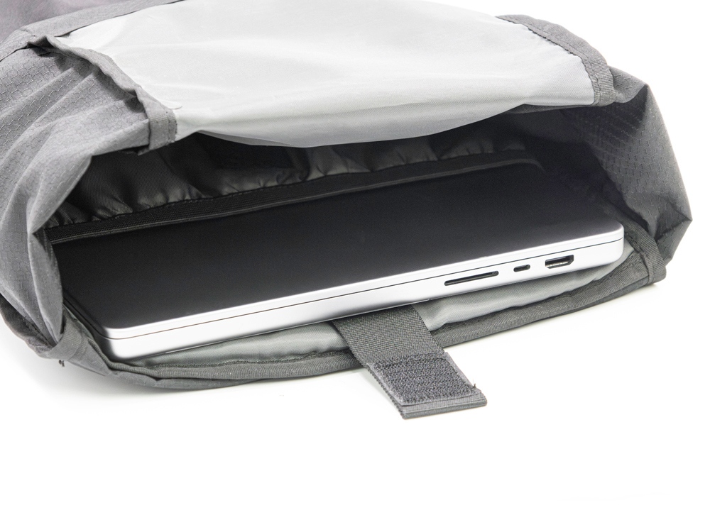 Легкий, элегантный, складывающийся рюкзак вместителен и удобен благодаря системе закрытия основного отделения roll-top, наличию трех наружных карманов спереди и по бокам из прочной эластичной сетки и внутреннему плотному карману для ноутбука до 16. Лямки с эластичными карманами для карт, телефона и других мелочей фиксируются на груди пряжкой, которую можно отрегулировать по высоте под ваш рост. Эластичные фиксирующие шнурки имеют светоотражающее нанесение, что обеспечивает дополнительную защиту в темное время суток. Дышащая сетка на спинке обеспечивает удобство и комфорт. На нагрудной пряжке предусмотрен свисток для экстренного случая. Водостойкая ткань верха изготовлена из переработанного пластика, пропитана специальным составом против загрязнения. В комплекте металлический шильд для нанесения вашего логотипа.