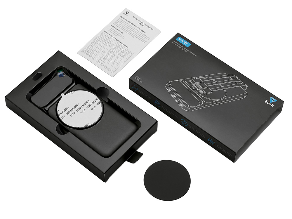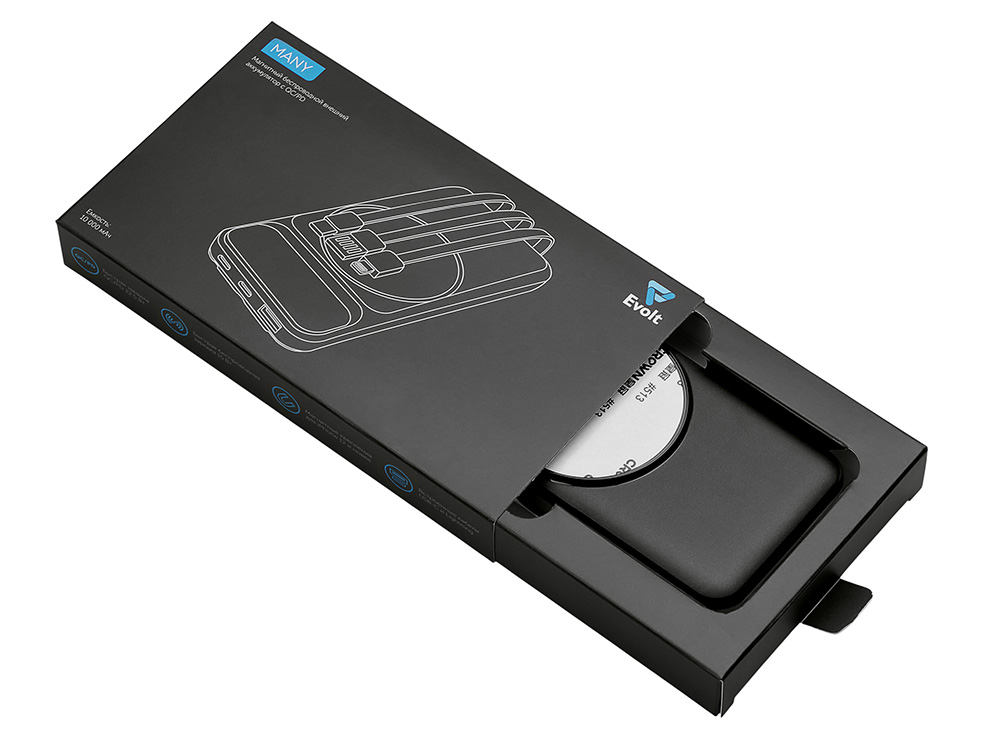 Магнитный беспроводной внешний аккумулятор со встроенными кабелями Мэни,быстаря зарядка, 10000 мАч, черный