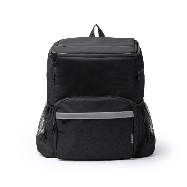 Рюкзак-холодильник из 600D RPET. Основной отсек и верхний карман с изотермической внутренней частью, которая помогает поддерживать оптимальную температуру пищи и позволяет хранить меньшие закуски. Кроме того, эти отсеки оснащены водонепроницаемыми застежками-молниями, что позволяет хранить содержимое более надежно и обеспечивает лучшую защиту от воды и влаги. Передний внешний карман на застежке-молнии со светоотражающей полосой для улучшения видимости. Два боковых отсека с застежкой-молнией и два дополнительных сетчатых отсека для переноски других предметов, таких как бутылки. Мягкие ручки и спинка.