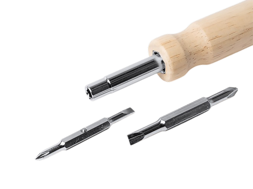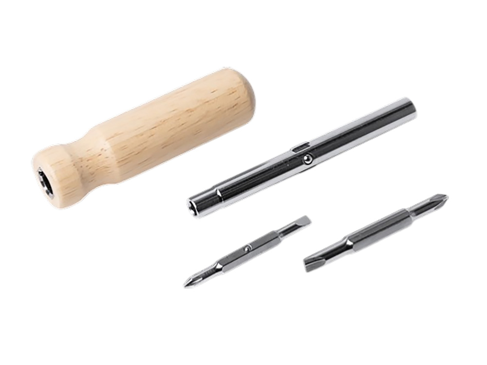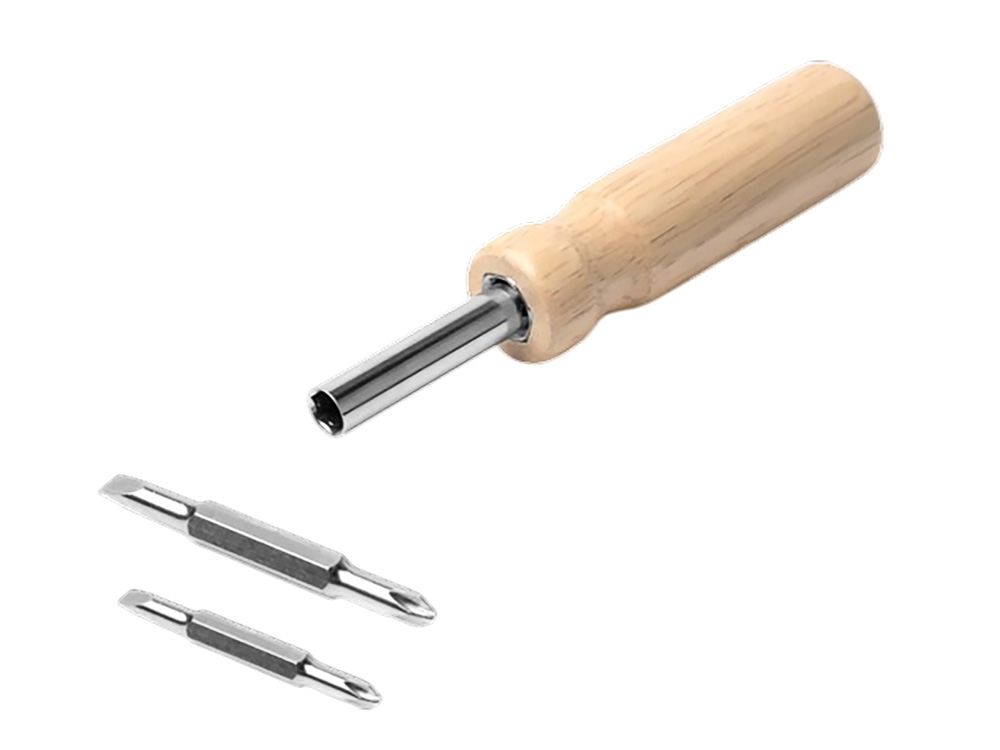 Отвертка из нержавеющей стали с круглой деревянной ручкой. В комплекте две биты с 2 насадками под крестовую и плоскую отвертки.