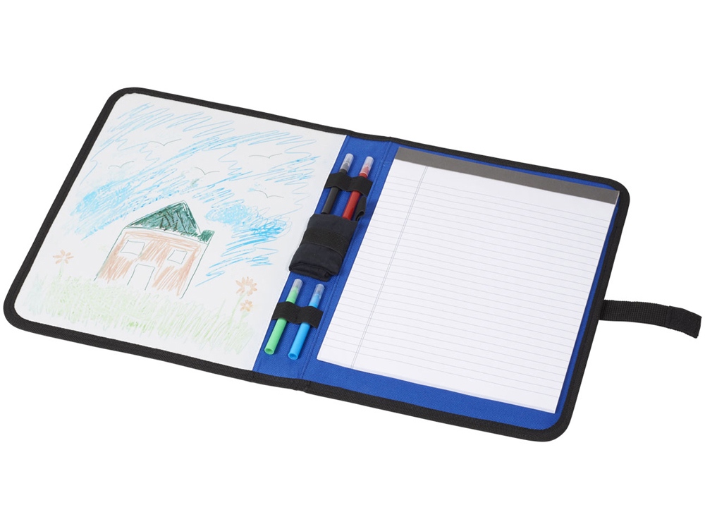 Папка Veela A4. Папка A4 с текстильной застежкой. Включает блокнот с 30 страницами линованной бумаги и доску. В комплект входят маркеры и салфетки. Полиэстер 600D.