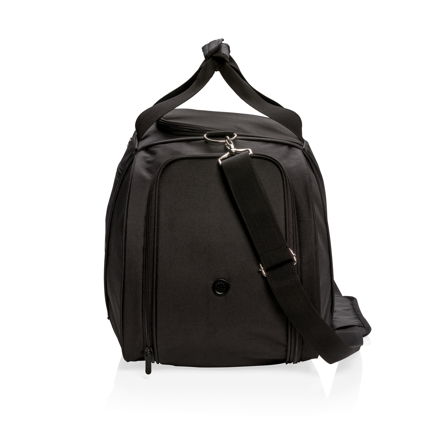 Сумка Swiss Peak из сверхпрочного полиэстера прочностью 600D и 1680D прекрасно подойдет для походов в спортзал или дальней поездки. Вместительное основное отделение закрывается П-образной молнией, есть специальное отделение для обуви с вентиляцией и боковой карман для бутылки. Универсальные удобные двойные ручки и регулируемый наплечный ремень. Не содержит PVC.