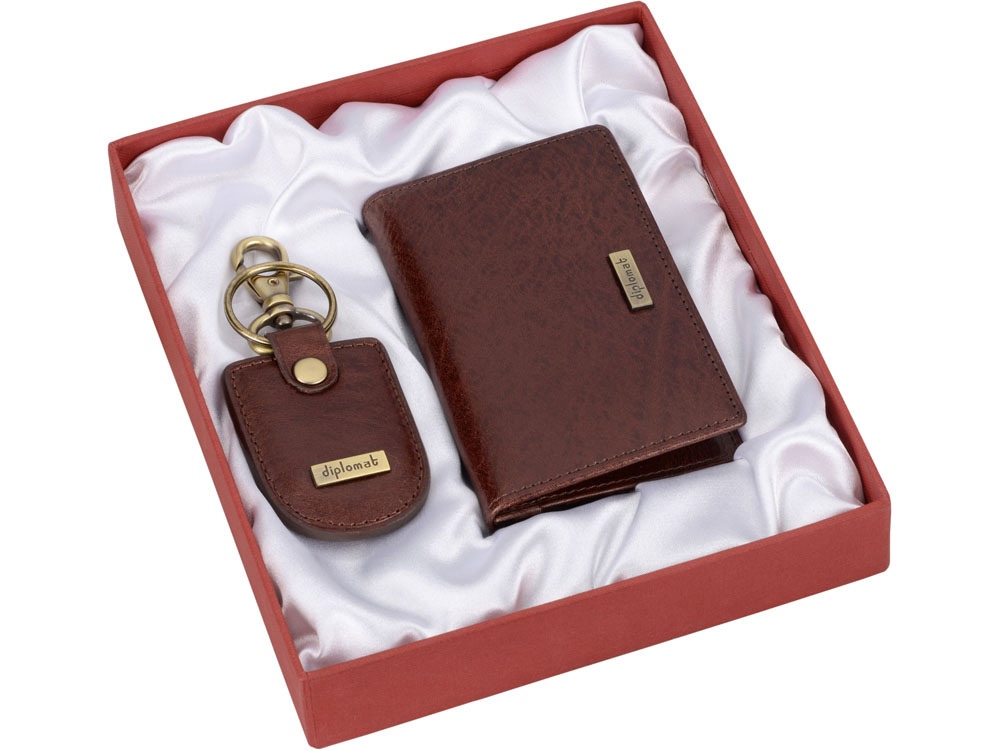 Практичный набор аксессуаров включает в себя вместительную визитницу и брелок, сделанные из высококачественной натуральной кожи коричневого оттенка. Аксессуары набора аккуратно упакованы в подарочный футляр с наименованием бренда.
