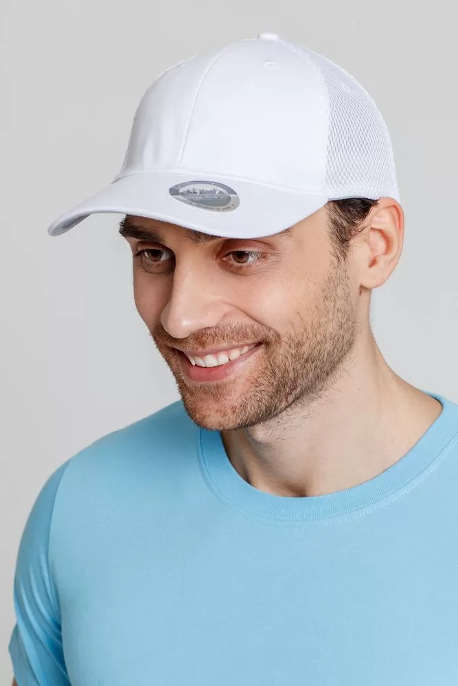 - Однотонная бейсболка из двух видов ткани: козырек и лобовые клинья из гладкого полотна, клинья на боках и на тыльной стороне из спортивной сетки