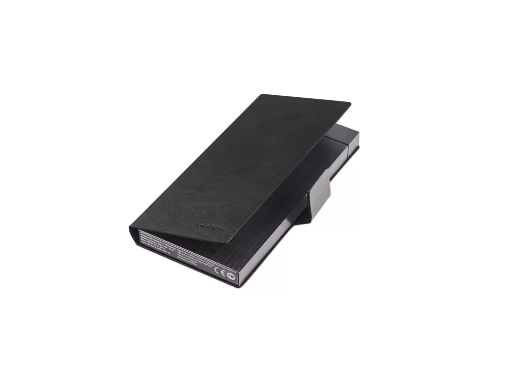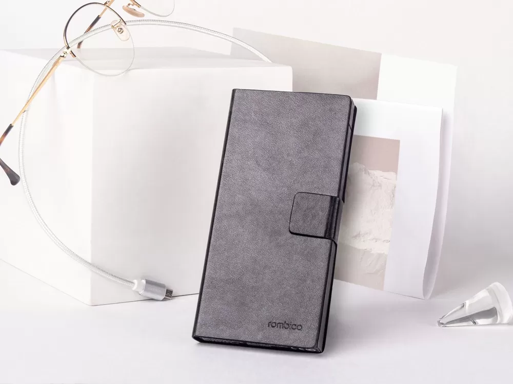 • Чехол-книжка с кожаной фактурой и карманами для банковских карт и визиток.