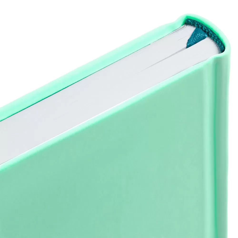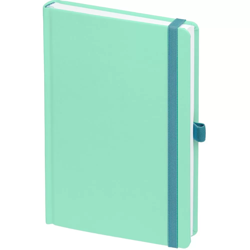 Ежедневник с твердой обложкой без поролона, выполнен из материала Soft Touch, цвет морской волны II, дополнен резинкой шириной 1 см, петлей-резинкой для ручки, капталом и ляссе темно-бирюзового цвета.
