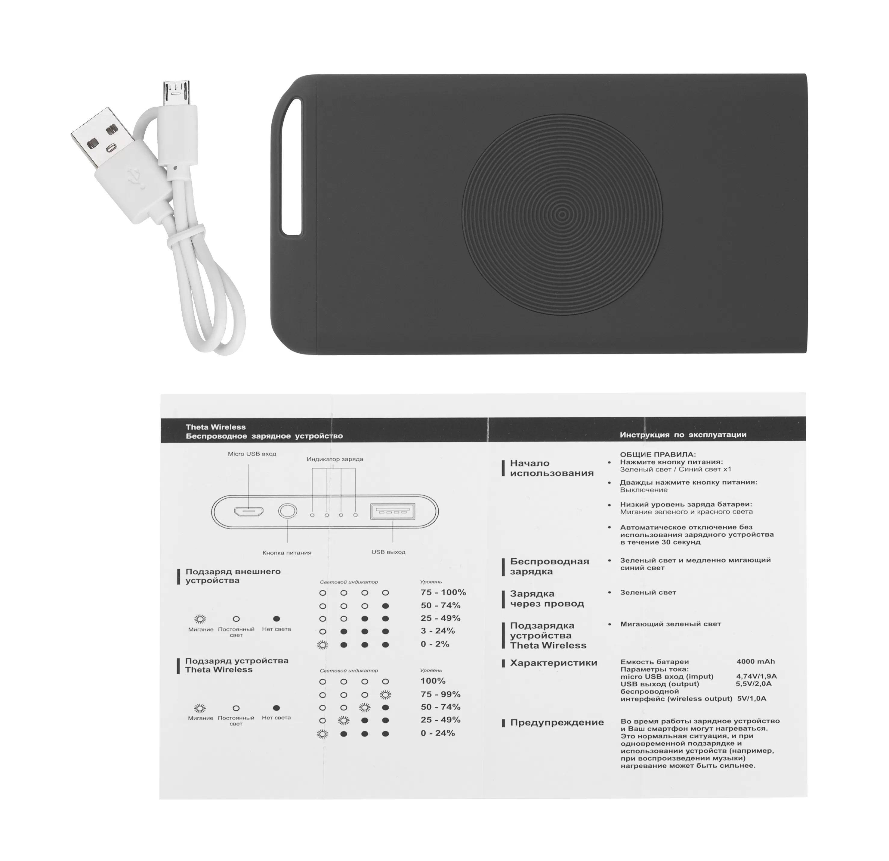 Беспроводное зарядное устройство Theta Wireless, 4000 mAh, черный