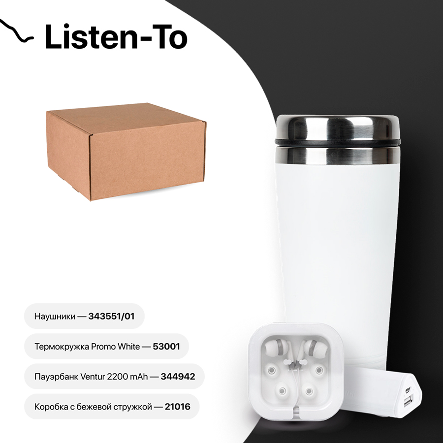 Набор подарочный LISTEN-TO: термокружка, зарядное устройсво, наушники, коробка, стружка, белый