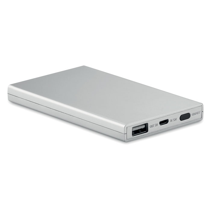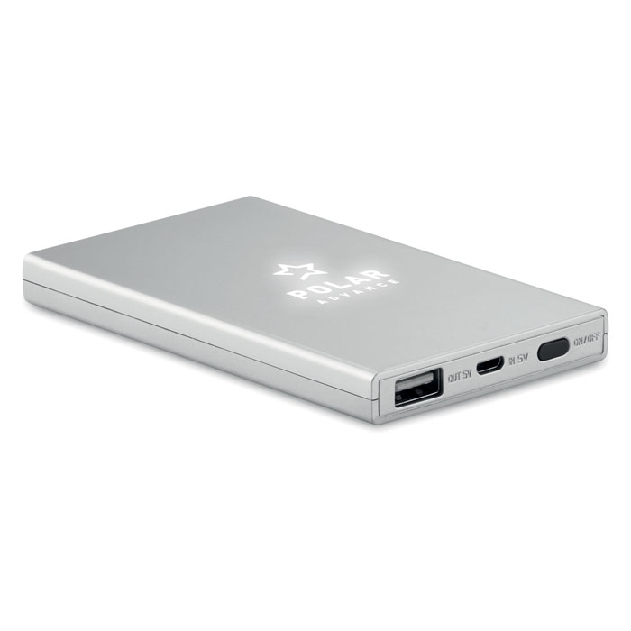 Внешний аккумулятор на 4000 мАч из алюминия со встроенным кабелем. Емкость для использования смартфона, выходной ток DC5V / 1A. Включает разъем. Во время зарядки подсвечивает логотип.