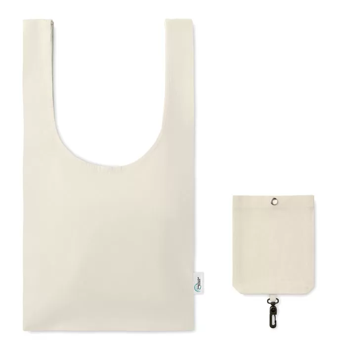 Большая складная сумка для покупок из переработанных материалов. 150 гр / м?. Состав 55% RPET и 45% хлопок. Включает мешочек с крючком и застежкой на кнопке. Сертификат GRS обеспечивает экологичность самого продукта, а также процесса его производства.
