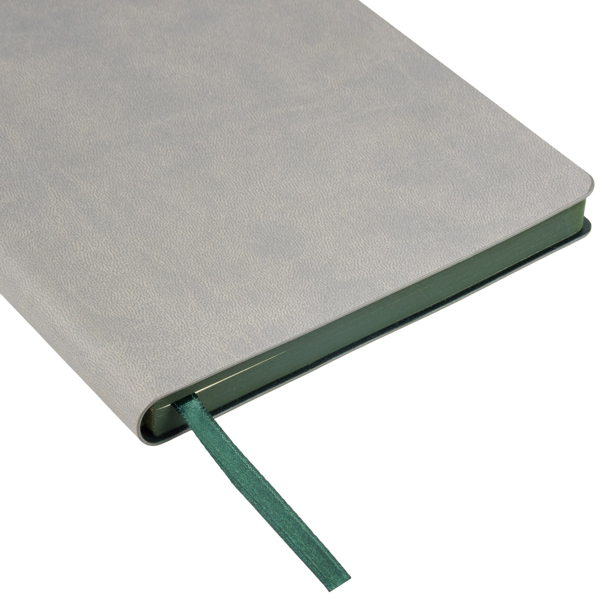 Недатированный ежедневник выполнен в гибкой обложке из искусственной кожи со скругленными уголками. Переплетный материал мягкий, слегка прорезиненный, гладкий и приятный на ощупь. Имеет мелкозернистый рисунок и легкий приглушенный блеск. Обложка не образует заломов, не расслаивается, устойчива к повреждениям. Цвет обложки классический серый, однородный, слегка припудренный. Форзац и нахзац матовые, темно-зеленого цвета. Создают гармоничный приглушенный контраст с обложкой. Срез матовый, в тон форзаца. Страницы теплые, кремовые, со скругленными уголками. Выполнены из приятного шелковистого офсета. Гладкое шелковистое темно-зеленое ляссе с легким отливом выполнено в тон форзаца. Общая тональность изделия природная и натуральная.
