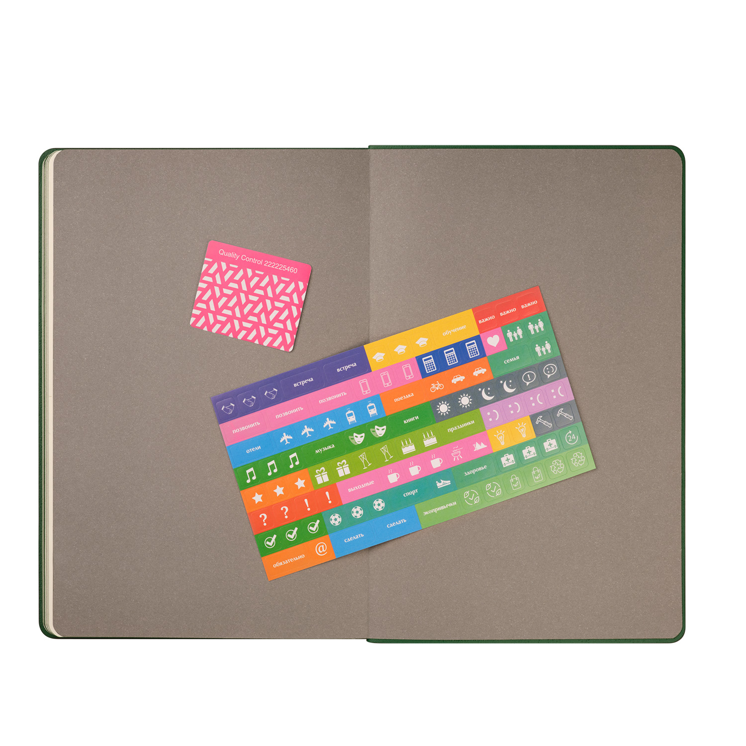 Современный технологичный дизайн и естественные приглушенные природные тона делают недатированный ежедневник оригинальным и запоминающимся. Изделие оценят любители стильных функциональных аксессуаров. Гибкая матовая обложка со скругленными уголками выполнена из искусственной кожи, имитирующей покрытие в стиле Hi-Tech. Переплетный материал с вертикальным рифлением, бархатистый, со слегка прорезиненным эффектом. За счет интересной рельефной фактуры прослеживается игра цвета при перемене освещения. Цвет – насыщенный зеленый, густой, плотный, однородный. Создает необычный красивый контраст с матовыми форзацем и нахзацем серого цвета. Срез матовый, в тон обложки. Страницы со скругленными уголками приятного глазу теплого светло-кремового цвета. Выполнены из гладкого шелковистого офсета. Ежедневник дополнен двойным атласным ляссе из лент серого и зеленого цветов, имеющих глянцевый отлив.
