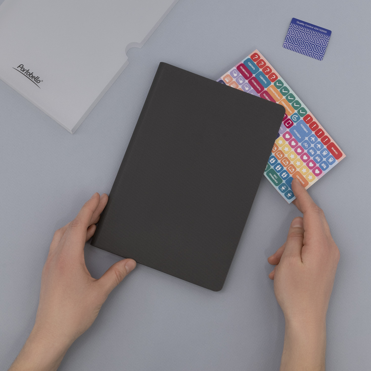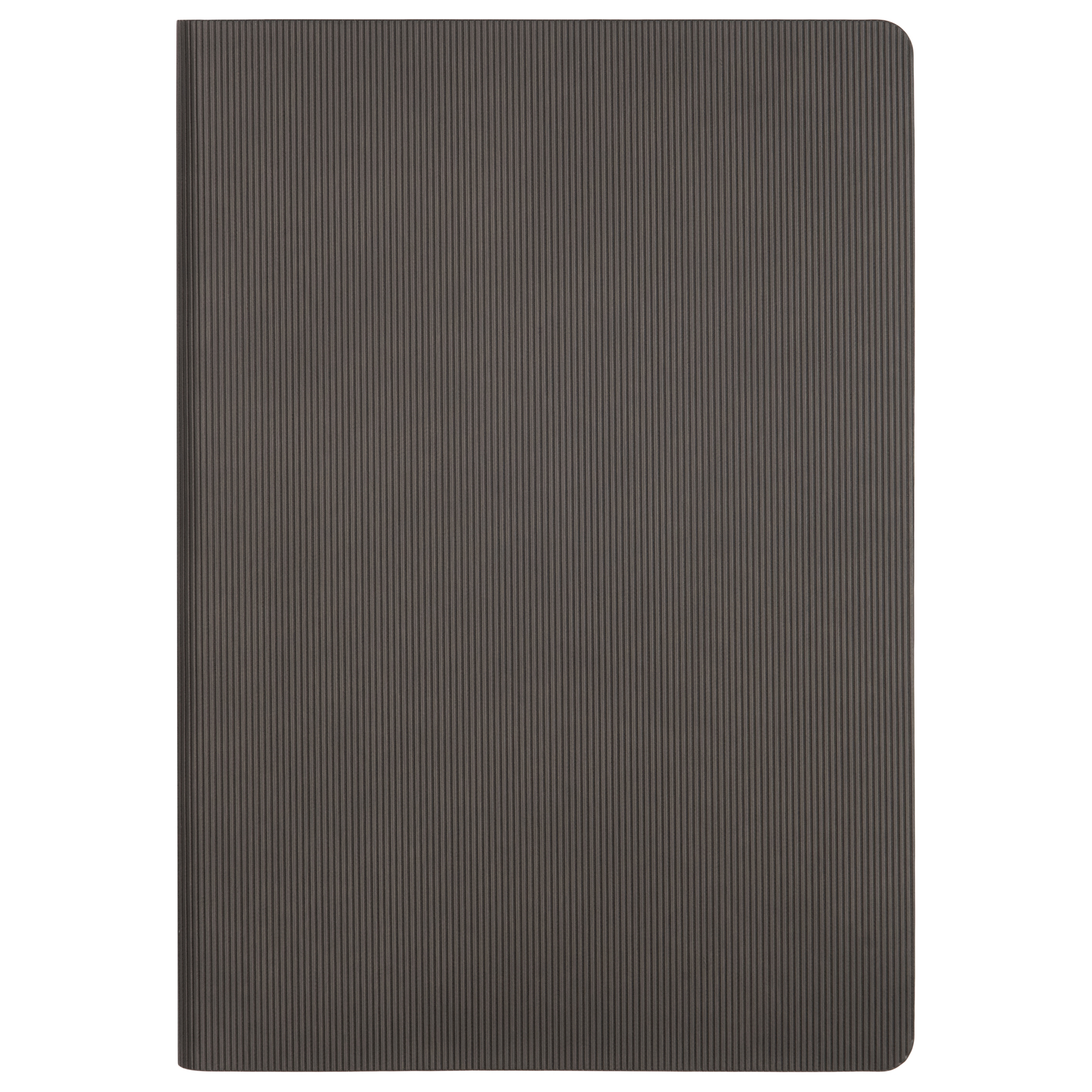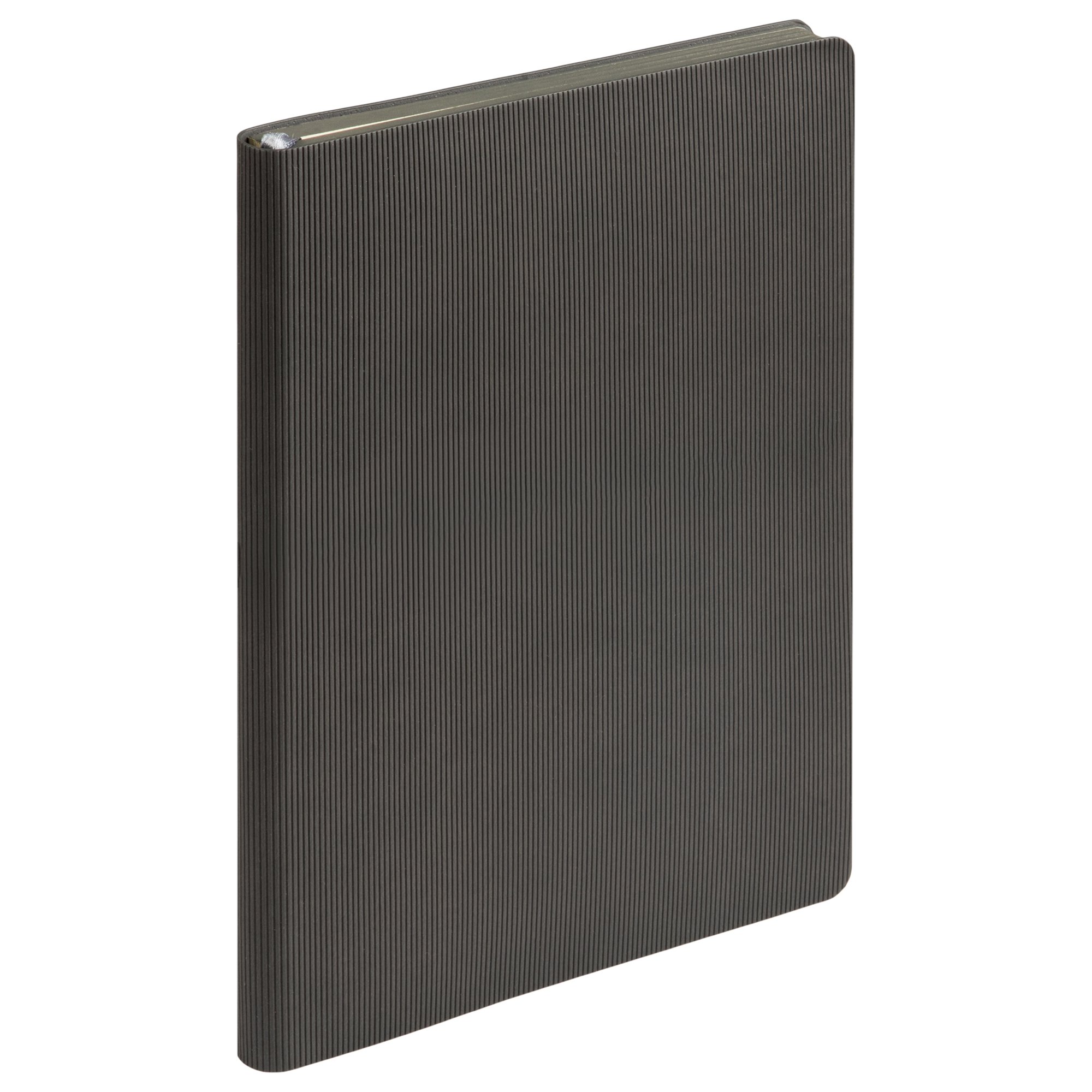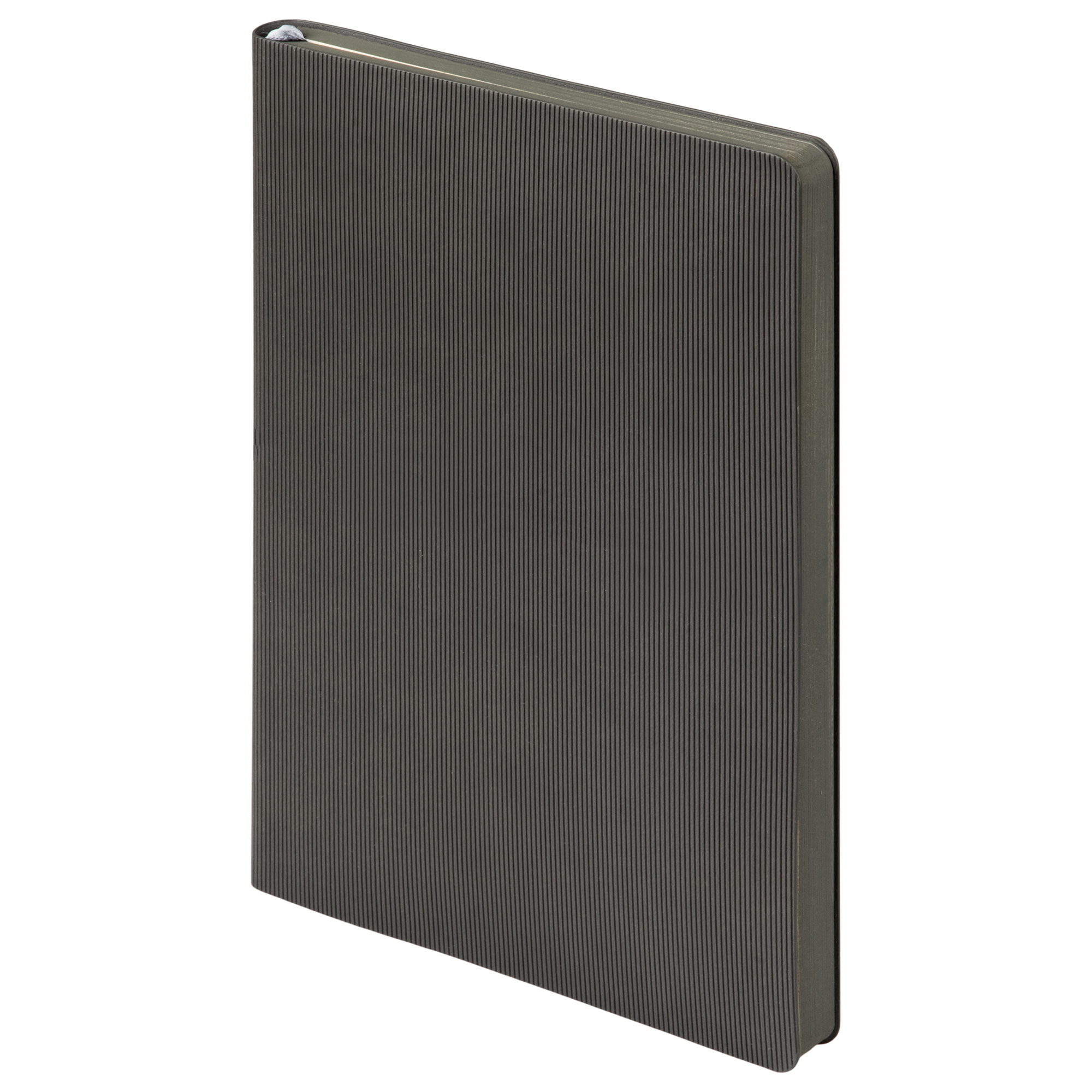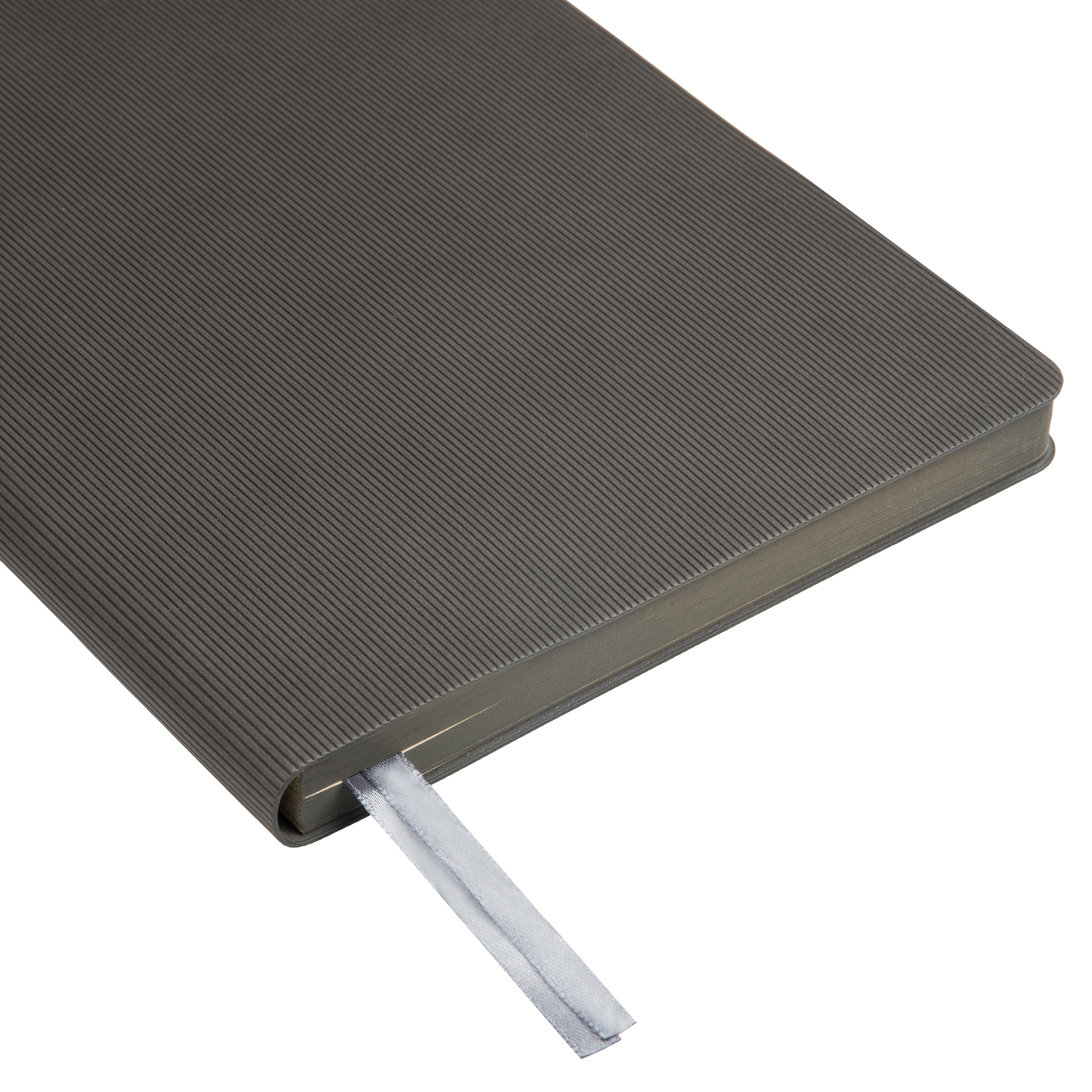 Недатированный ежедневник в стильном лаконичном сером цветовом решении. Цветовая палитра составлена из природных приглушенных тонов. Гибкая матовая обложка со скругленными уголками выполнена из искусственной кожи, имитирующей покрытие в стиле Hi-Tech. Переплетный материал с вертикальным рифлением, бархатистый, со слегка прорезиненным эффектом. За счет интересной рельефной фактуры прослеживается игра цвета при перемене освещения. Цвет – темно-серый, плотный, однородный. Создает органичный тандем с матовыми форзацем и нахзацем серого цвета. Срез матовый, в тон обложки. Страницы со скругленными уголками приятного глазу теплого светло-кремового цвета. Выполнены из гладкого шелковистого офсета. Ежедневник дополнен двойным атласным ляссе из лент серого цвета, имеющих глянцевый отлив.
