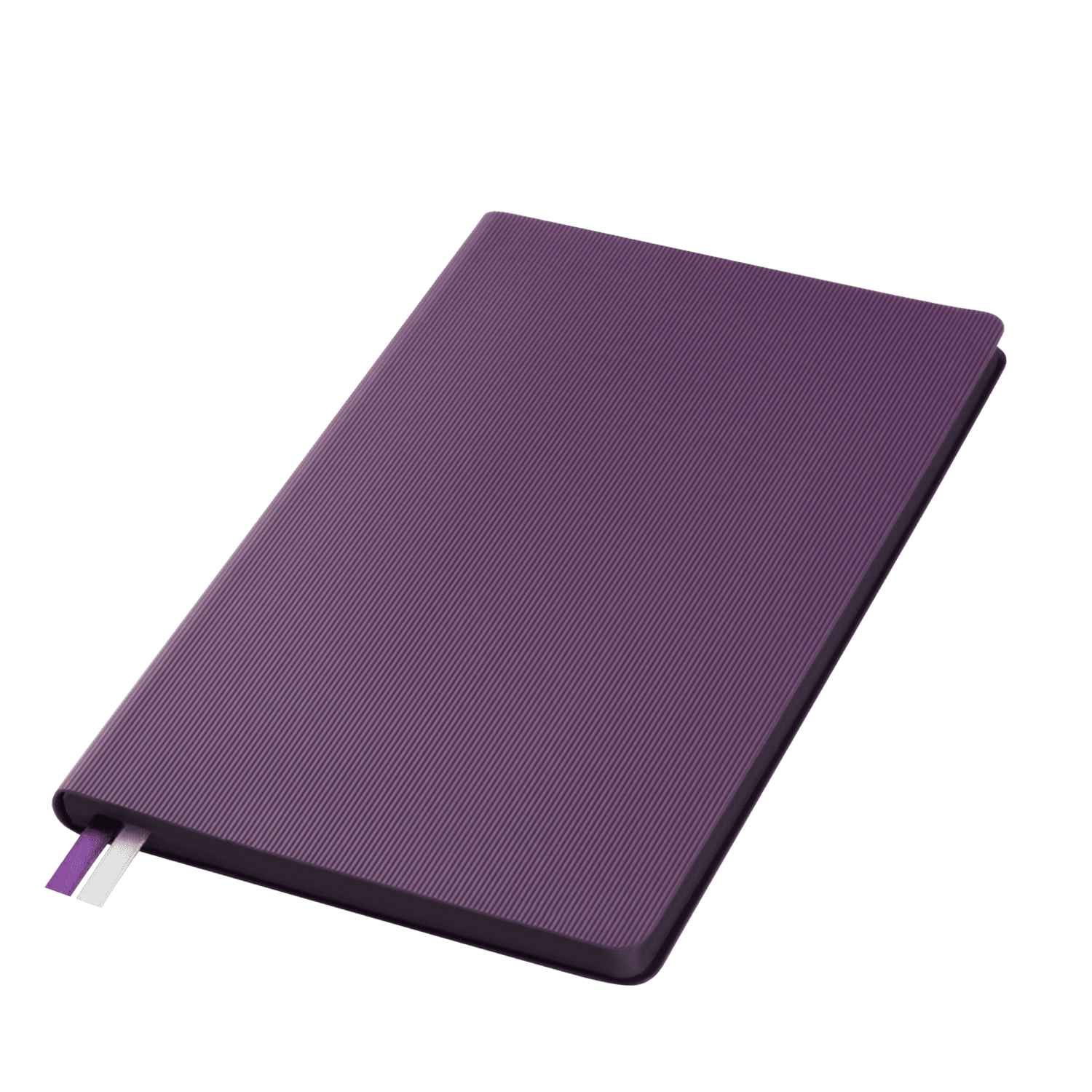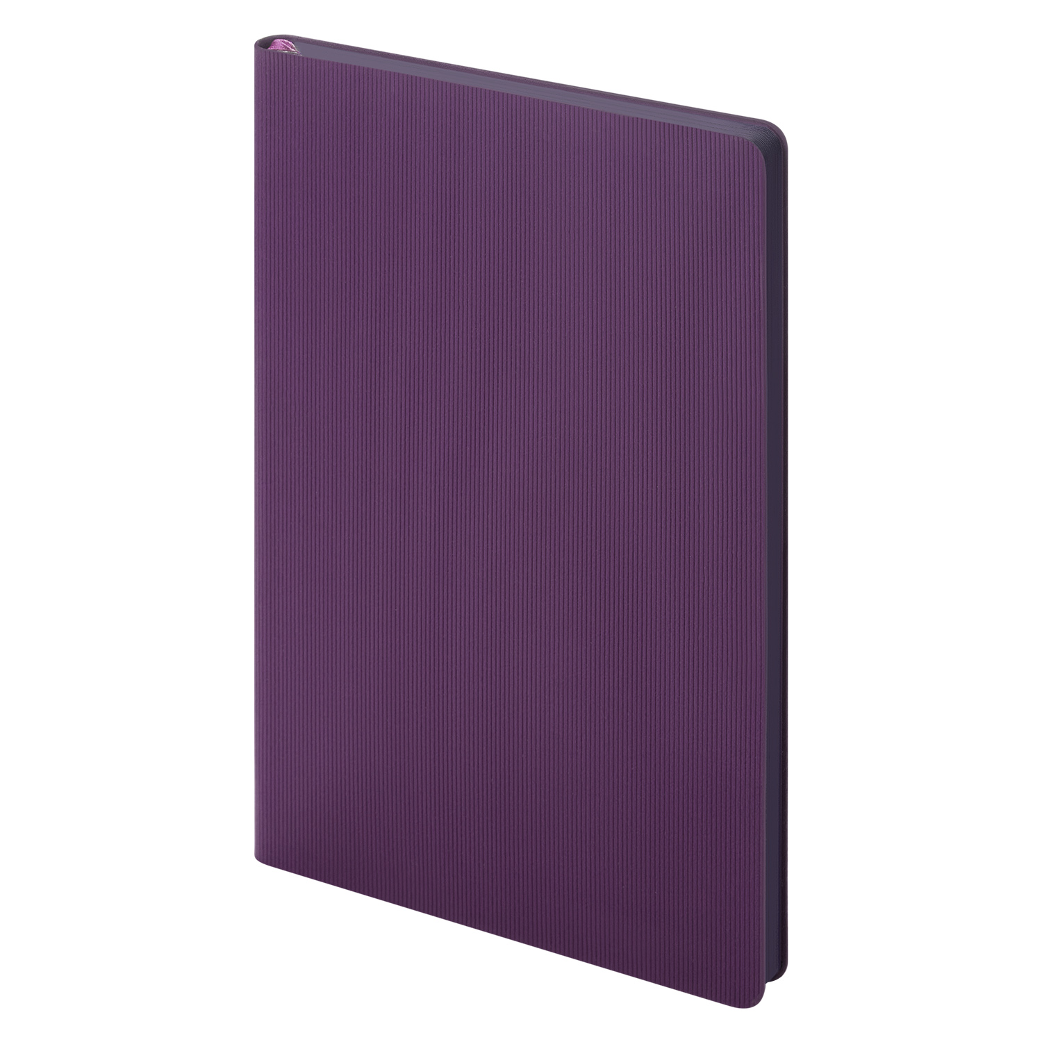 Недатированный ежедневник отличается современным технологичным дизайном и оригинальным цветовым ансамблем. Гибкая матовая обложка со скругленными уголками выполнена из искусственной кожи, имитирующей покрытие в стиле Hi-Tech. Переплетный материал с вертикальным рифлением, бархатистый, со слегка прорезиненным эффектом. За счет интересной рельефной фактуры прослеживается игра цвета при перемене освещения. Цвет – фиолетовый, насыщенный, плотный, однородный. Создает органичный природный тандем с матовыми форзацем и нахзацем серого цвета. Срез матовый, в тон обложки. Страницы со скругленными уголками приятного глазу теплого светло-кремового цвета. Выполнены из гладкого шелковистого офсета. Ежедневник дополнен двойным атласным ляссе из лент серого и фиолетового цветов, имеющих глянцевый отлив.