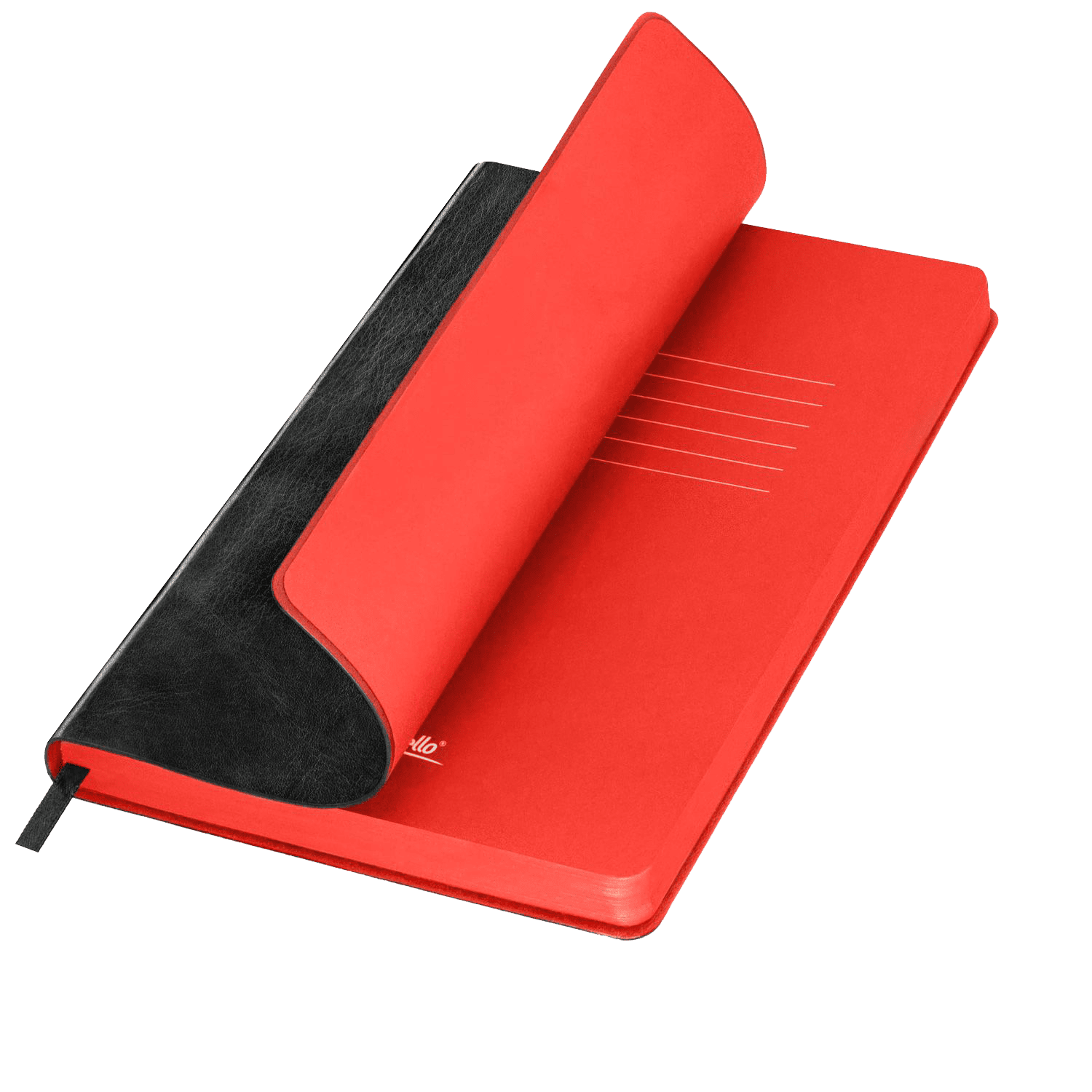 Эффектный недатированный ежедневник выполнен в гибкой обложке со скругленными уголками из искусственной кожи с эффектом «венецианской штукатурки». На ощупь поверхность гладкая, глянцевая, фактурно ощущается характерный для кожи мелкий рельеф. Не образует заломов, не расслаивается. Цвет обложки – классический черный, глубокий, густой, однородный. Тон за счет фактуры может меняться в зависимости от освещения. Цвет матовых форзаца и нахзаца – красный, насыщенный, динамичный. Ярко контрастирует с обложкой. Срез матовый, выполнен в тон форзаца и нахзаца. Страницы со скругленными уголками теплого светло-кремового оттенка из гладкого шелковистого офсета. Одинарное атласное черное ляссе с легким глянцевым отливом. Ширина ляссе 6 мм.Упаковка: пластиковая коробка - есть