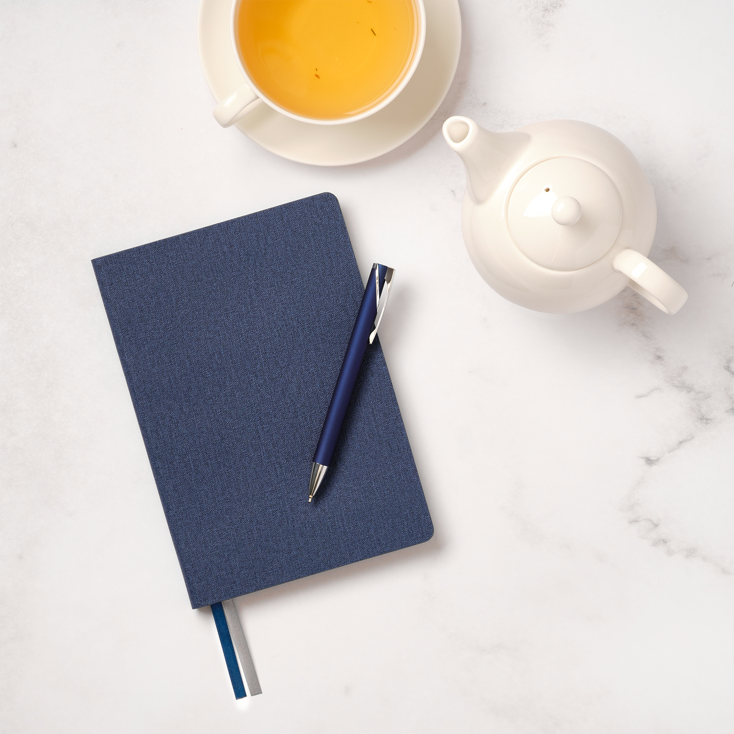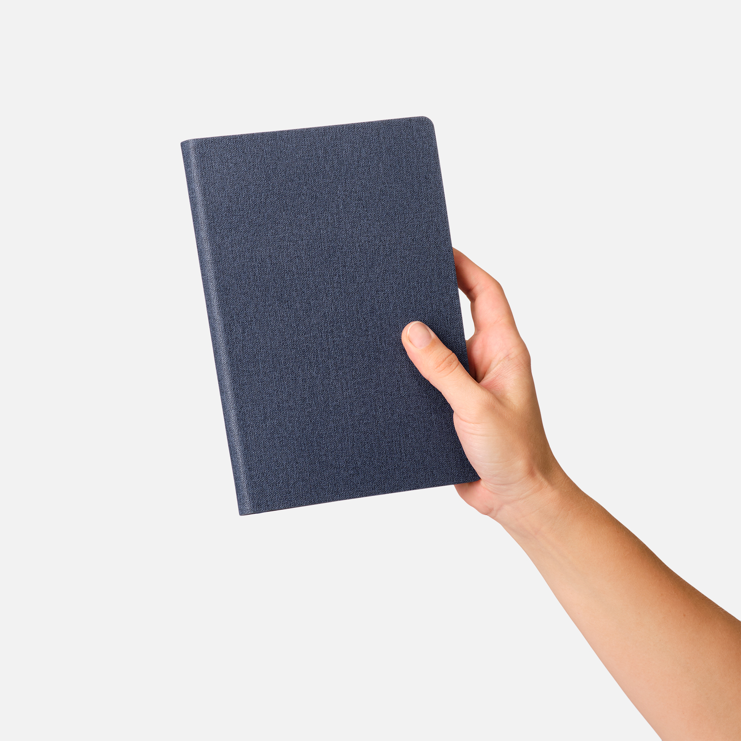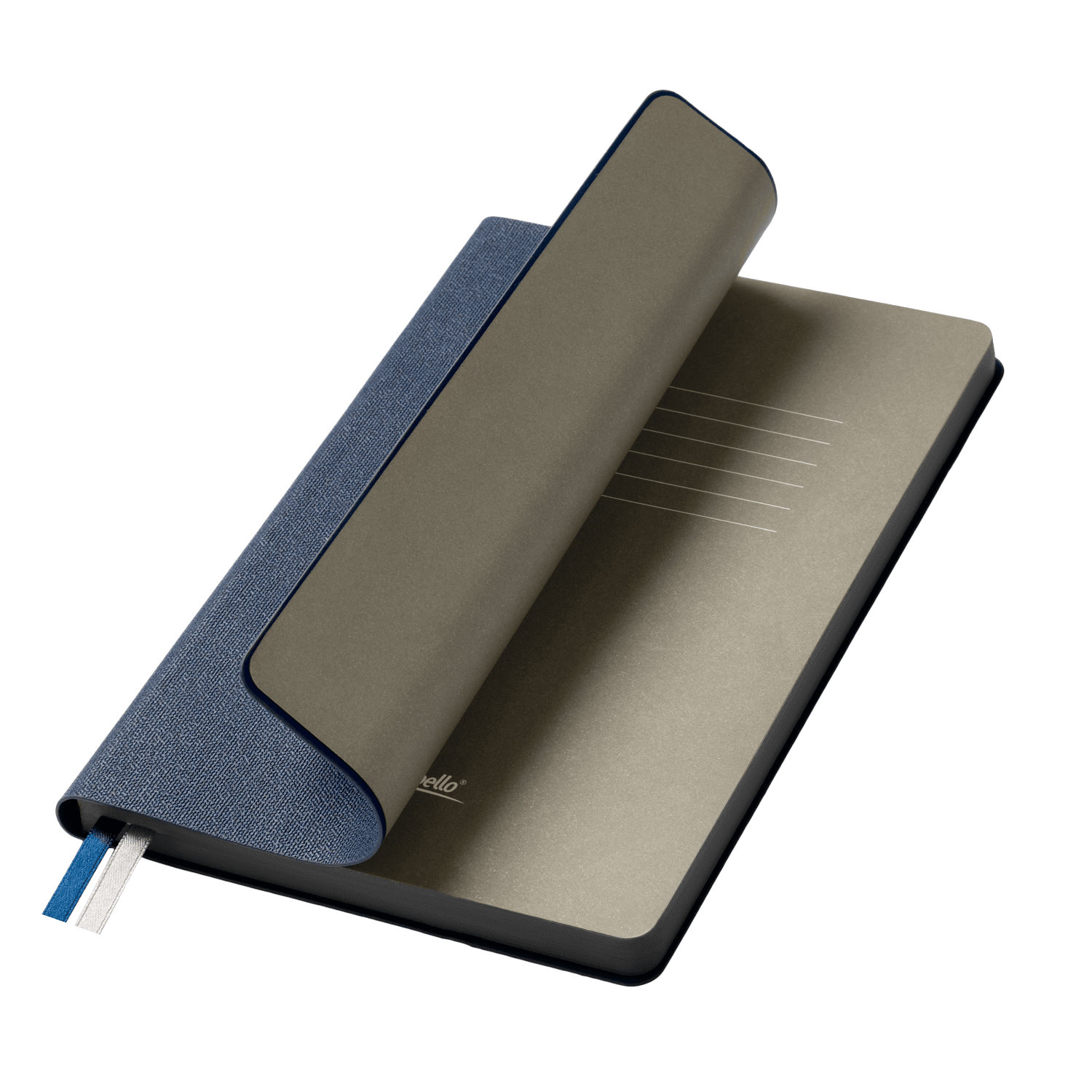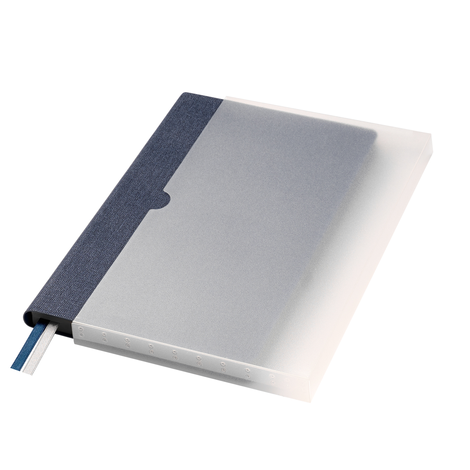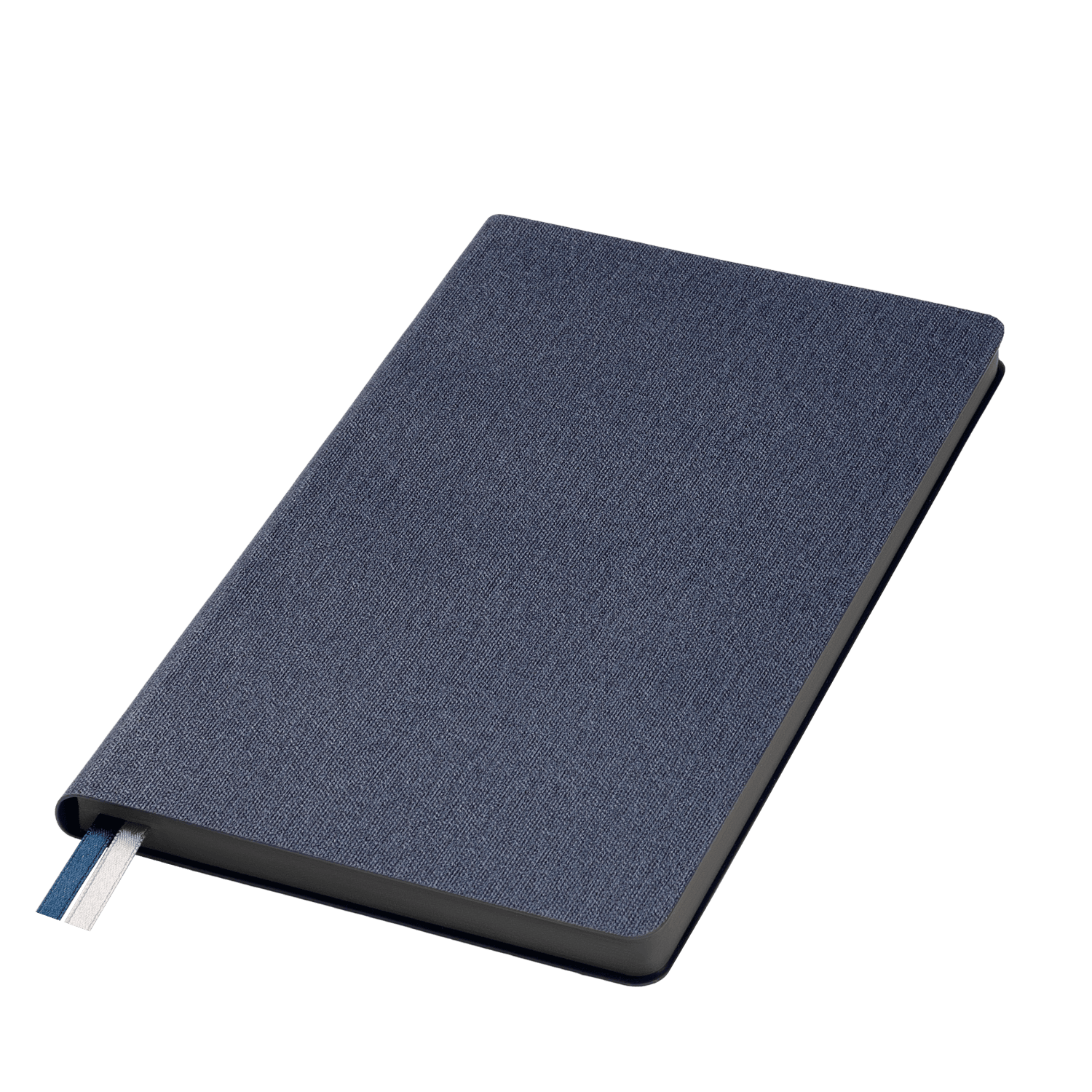 Недатированный ежедневник исполнен в холодной атмосферной тональности. Гибкая обложка из искусственной, слегка прорезиненной кожи со скругленными уголками. Рельефная фактура переплетного материала имитирует твид с характерным для этого вида шерстяной ткани мелким однородным плетением. Не блестит. Цвет – синий, динамичный, насыщенный, с более темными и светлыми вкраплениями, образуемыми за счет рельефа. Форзац и нахзац матовые, однородного серого цвета. Страницы со скругленными уголками кремового цвета из гладкого, слегка шелковистого офсета. Срез матовый, темно-серый. Двойное атласное ляссе составлено из лент синего и серого цветов, имеет легкий блеск. Ширина каждой ленты 6 мм.