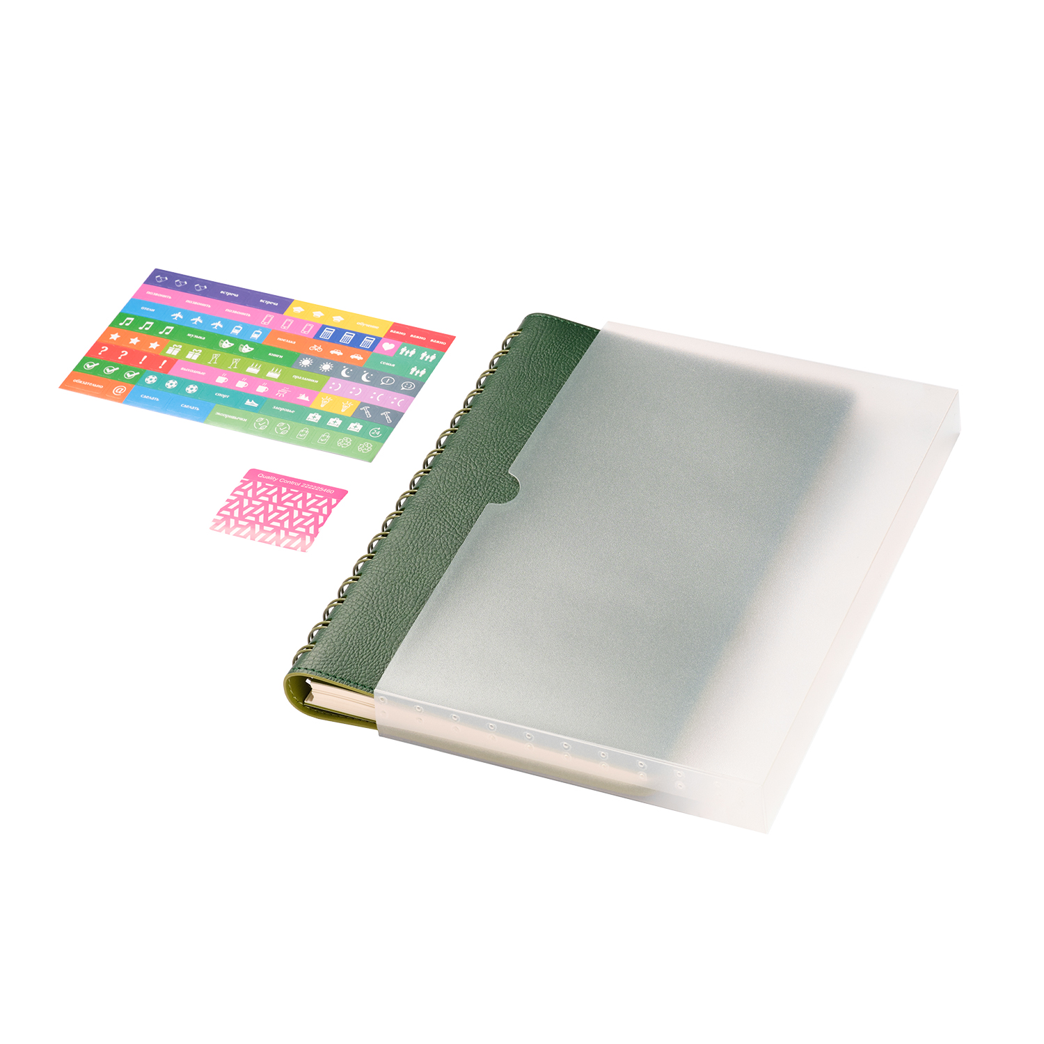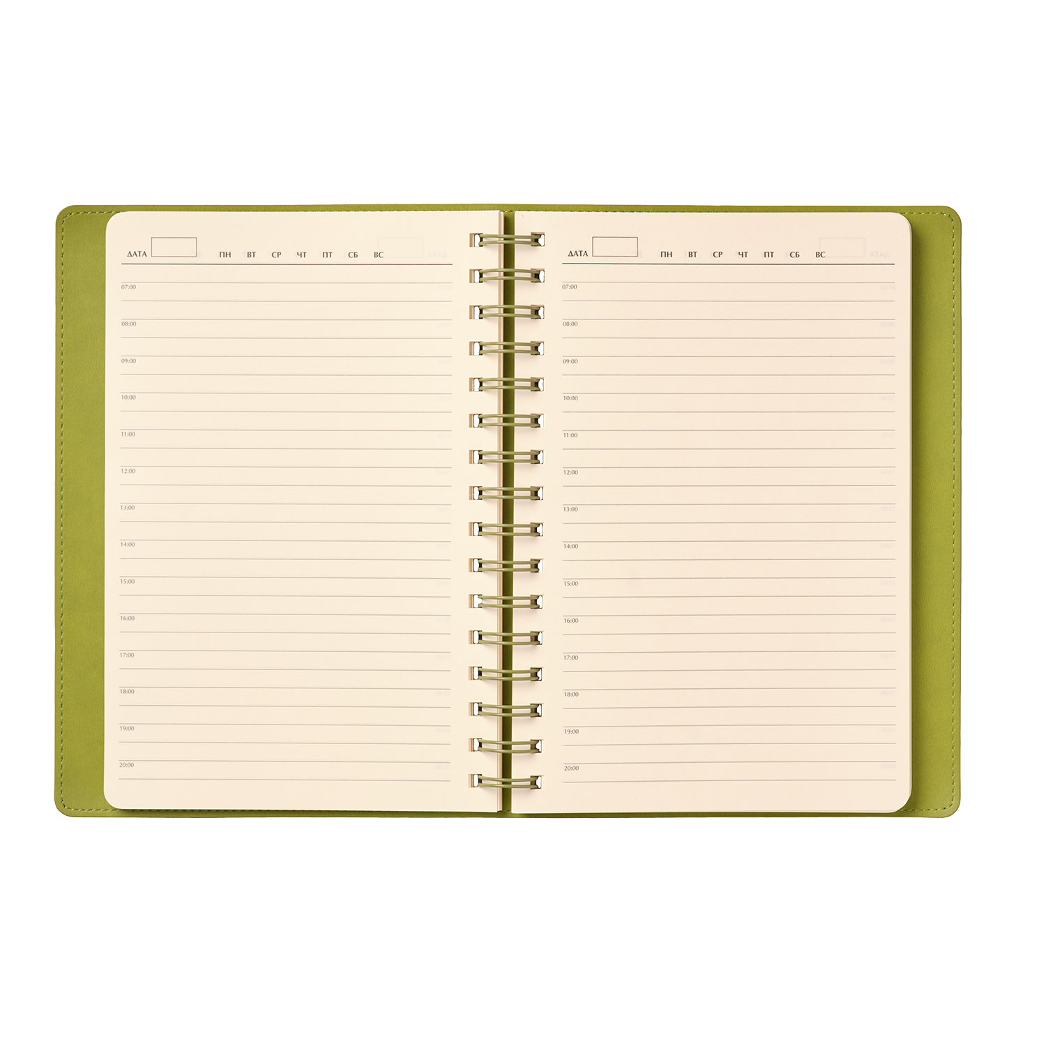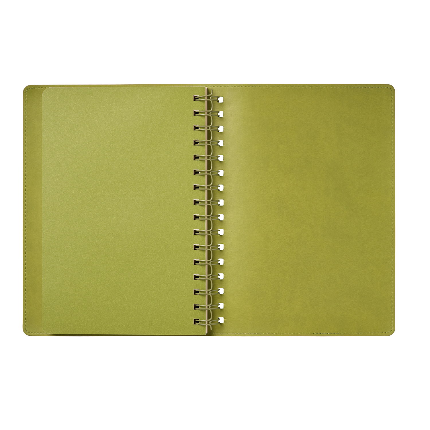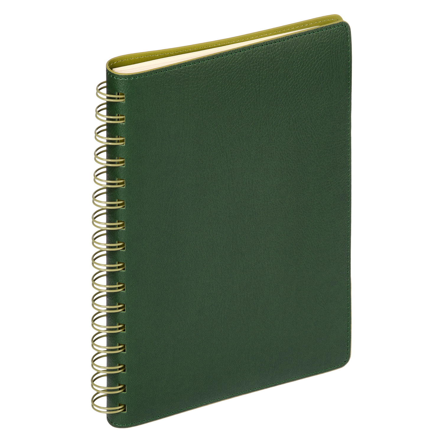 Недатированный ежедневник в гибкой обложке со скругленными уголками из искусственной кожи. Обложка выполнена из сшивки двух материалов. Внешний материал обложки матовый, с некрупным рельефом под натуральную кожу. Цвет – зеленый, приглушенный, однородный. Внутренний материал обложки – Latte – бархатистый, мелкозернистый, однородного яркого салатового цвета. По периметру обложки выполнена прошивка в тон. Форзац и нахзац контрастные, салатовые. Теплые кремовые страницы со скругленными уголками выполнены из гладкого шелковистого офсета. Срез матовый, в тон страниц. Ежедневник надежно скреплен полускрытой пружиной в цвет внутреннего материала обложки. Изделие комплектуется вкладышем с цветными стикерами и индивидуальной упаковкой.Упаковка: пластиковая коробка – есть