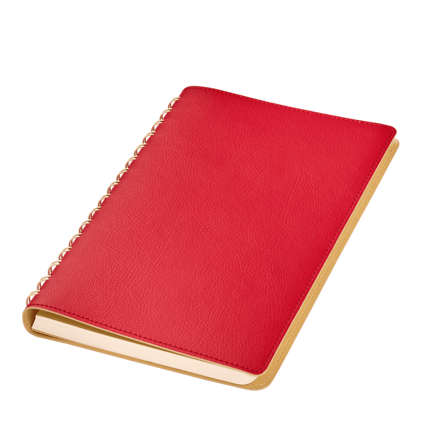 Недатированный ежедневник в гибкой обложке со скругленными уголками из искусственной кожи. Обложка выполнена из сшивки двух материалов. Внешний материал обложки матовый, с некрупным рельефом под натуральную кожу. Цвет – яркий красный, однородный. Внутренний материал обложки – Latte – бархатистый, мелкозернистый, однородного светло-бежевого цвета. По периметру обложки выполнена прошивка в тон. Форзац и нахзац контрастные, бежевые. Теплые кремовые страницы со скругленными уголками выполнены из гладкого шелковистого офсета. Срез матовый, в тон страниц. Ежедневник надежно скреплен полускрытой пружиной в цвет внутреннего материала обложки. Изделие комплектуется вкладышем с цветными стикерами и индивидуальной упаковкой.Упаковка: пластиковая коробка – есть