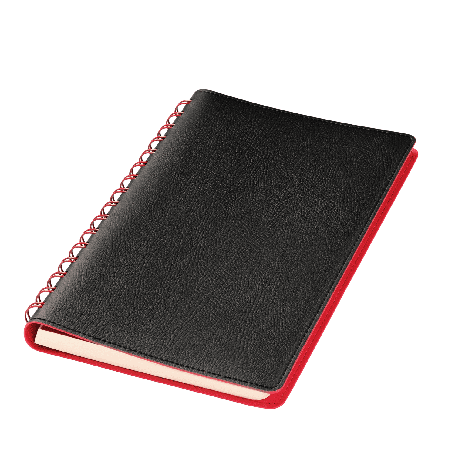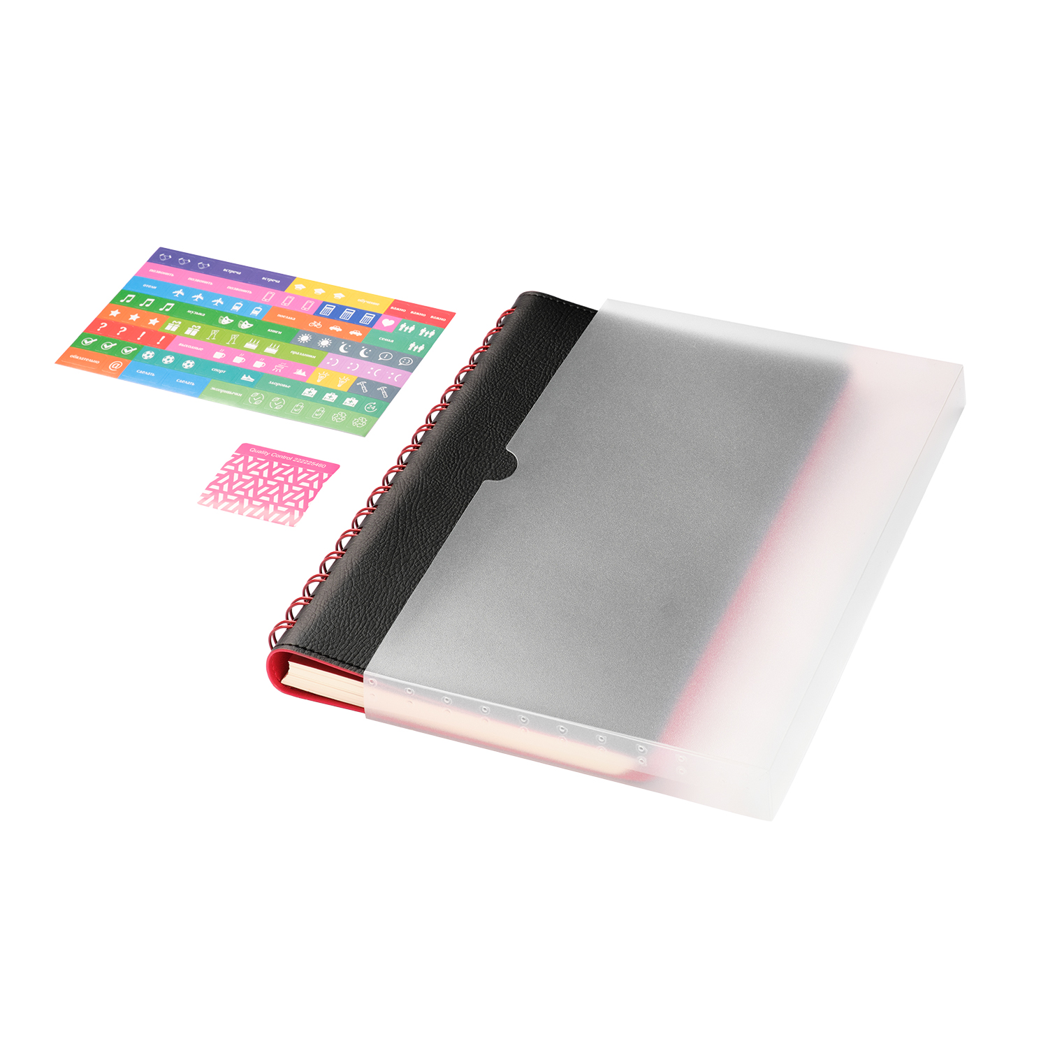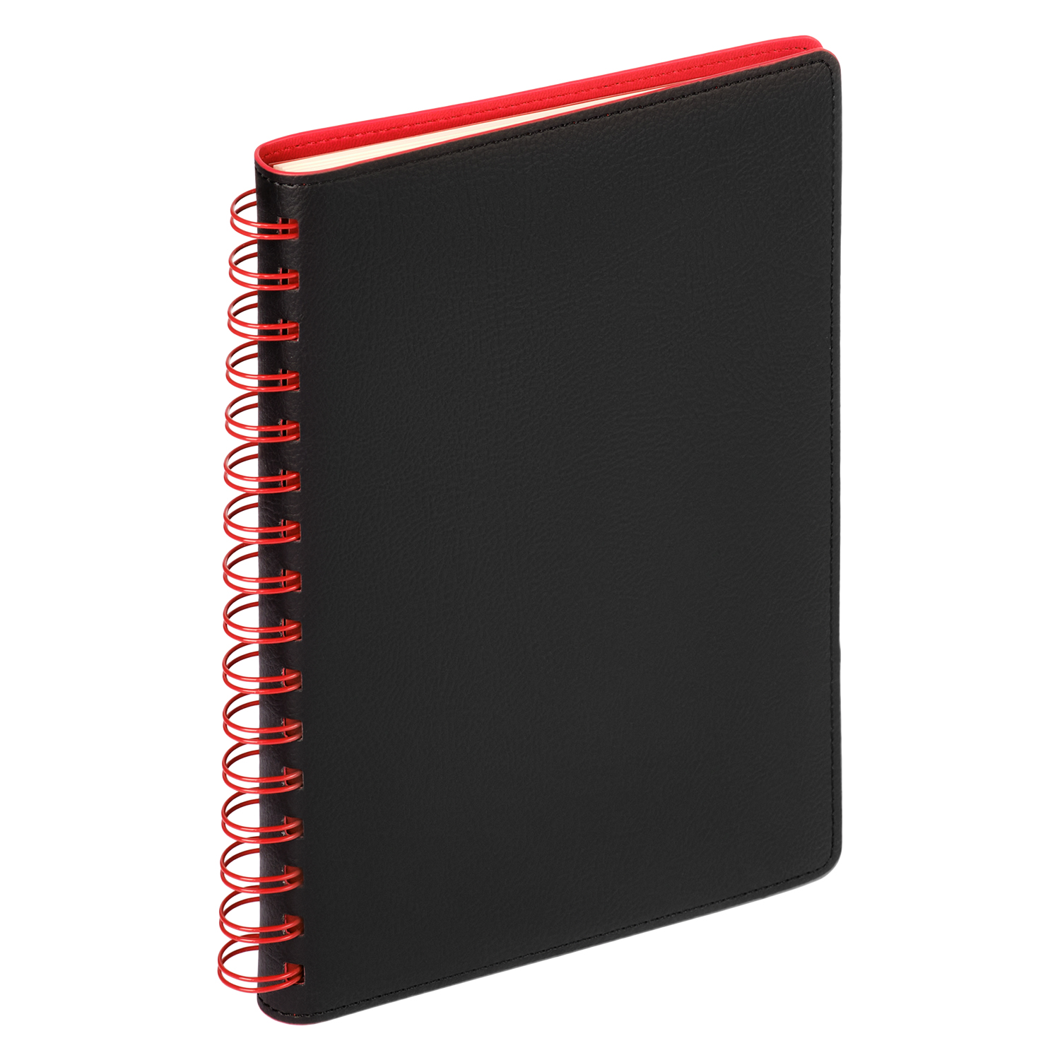 Недатированный ежедневник в гибкой обложке со скругленными уголками из искусственной кожи. Обложка выполнена из сшивки двух материалов. Внешний материал обложки – матовый, с некрупным рельефом под натуральную кожу. Цвет – черный, насыщенный, динамичный, однородный. Внутренний материал обложки – Latte – бархатистый, мелкозернистый, ярко-красного цвета. По периметру обложки выполнена прошивка в тон. Форзац и нахзац контрастные, ярко-красного цвета. Теплые кремовые страницы со скругленными уголками выполнены из гладкого шелковистого офсета. Срез матовый, в тон страниц. Ежедневник надежно скреплен полускрытой пружиной в цвет внутреннего материала обложки. Изделие комплектуется вкладышем с цветными стикерами и индивидуальной упаковкой.