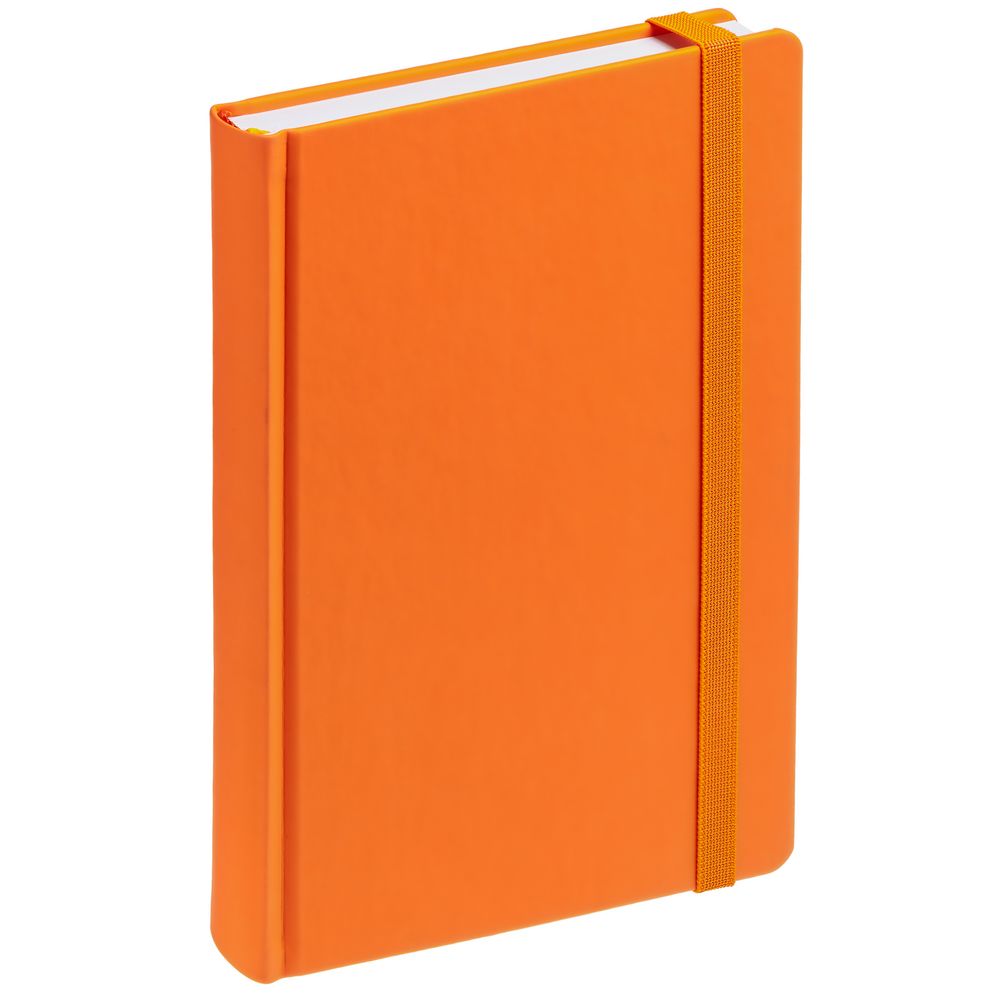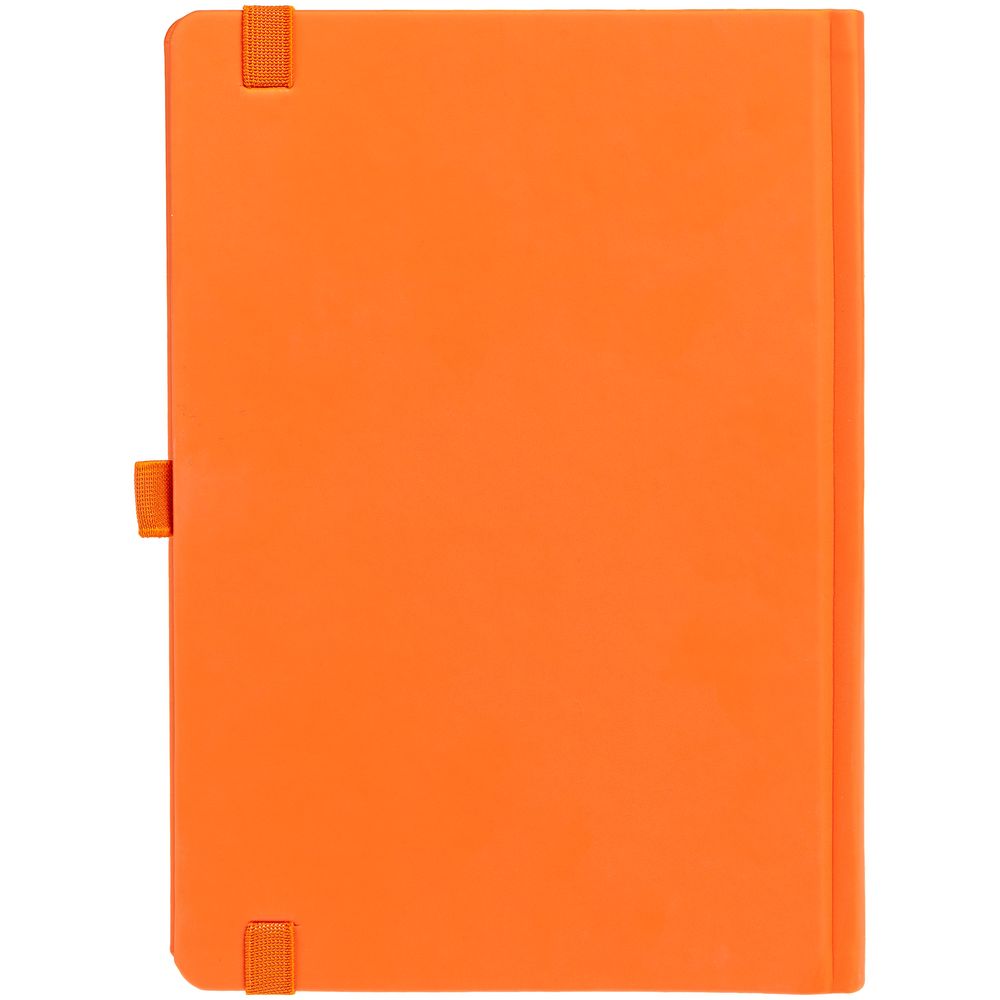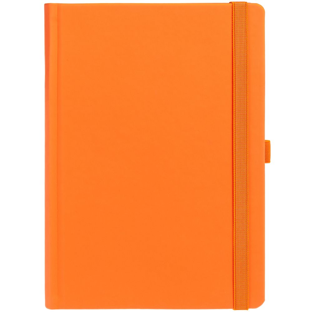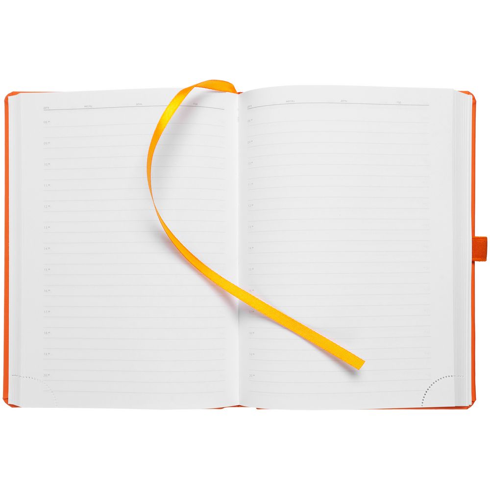 Ежедневник с твердой обложкой без поролона, выполнен из материала Soft Touch, оранжевый ОО, дополнен резинкой шириной 1 см, петлей-резинкой для ручки, капталом и ляссе оранжевого цвета.