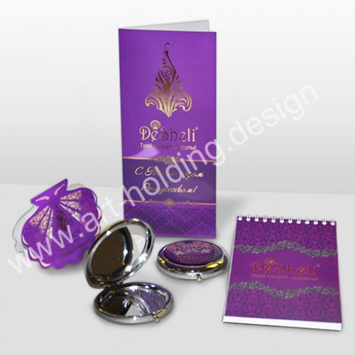 Специально для компании DeSheli дизайнерская группа "Арт-Холдинг" разработала линию подарочных сувениров и промоизделий. В набор вошли: дизайнерское зеркальце с индивидуальным дизайном, блокнот и подарочная открытка. Все изделия были выполнены в корпоративном стиле компании и стали очаровательным знаком внимания для всех клиентов DeSheli в новогодние праздники.