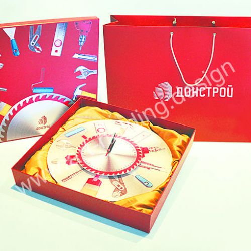 Индивидуально подобранные инструменты строителя, символизирующие циферблат, нашли свое воплощение в эксклюзивных настенных часах, разработанных по уникальному эскизу специально для компании "ДОНСТРОЙ". Круглые настенные часы из стекла, созданы уникальным методом нанесения полноцветного изображения - припеканием "Дуплекс", благодаря которому стекло может стать настоящим произведением искусства, украшением мебели и всего интерьера. Специально разработанная конструкция коробки, не только удобна в открывании, но и способна надежно сохранить эксклюзивный подарок, благодаря ложементу, декорированному атласным шелком.