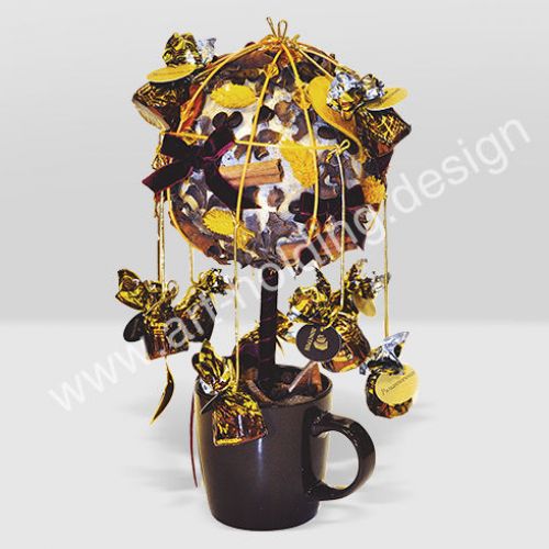 Эксклюзивный кофейный топиарий, представленный в подарке, выполнен из натуральных зерен кофе в форме дерева счастья. Уже при одном взгляде на диковинный сувенир открывается настоящее торжество кофейных вкусов, запахов и красок! Композиция украшена цельными палочками корицы, сухоцветами из цитрусовых и соцветиями аниса, а также шоколадными конфетами с декором в виде кофейных зернышек, на которых написаны комплименты для виновниц торжества! Так, при каждой порции шоколадного десерта обладательница подарка найдет для себя и новый сладкий эпитет: «нежная», «милая», «очаровательная» и другие красивые слова, благотворно влияющие на настроение представительниц прекрасного пола! Чудо-дерево посажено в элегантную кружку кофейного оттенка, а также до краев наполненную кофейными зернами и шоколадными конфетами, от которых исходит потрясающий теплый аромат!