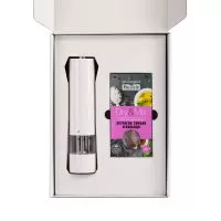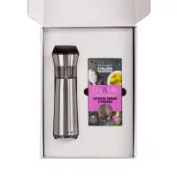 чай - картон, купаж чая; цукаты - полиэтилен, вяленая вишня; наполнитель - бумага; колонка - пластик, покрытие софт-тач; кофе - алюминиевая фольга, купаж зерен арабики и робусты; чайная пара - фаянс; коробка - переплетный картон