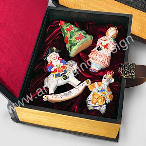 Елочные игрушки ручной работы, выполненные в технике майолика специально для компании "НЛМК". а также деревянная коробка ручной работы со вставкой в технике майолика.