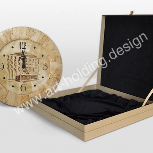 Специально для компании НЛМК команда «Арт-Холдинг» представила эксклюзивные настенные часы из карельской березы ручной работы. На циферблате выгравировано здание центрального офиса компании. При этом, благодаря особой текстуре древесины карельской березы, напоминающей своим рисунком узоры мрамора, часы выглядят дорого и солидно! Подарок оформлен в брендированную коробку, стилизованную под карельскую березу.