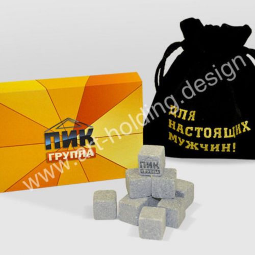 Специально для компании "ПИК Группа" дизайнерской группой "Арт-Холдинг" был разработан эксклюзивный подарочный набор с камнями для виски. Набор для виски - великолепный подарок для истинных гурманов, которые предпочитают изысканные спиртные напитки! Эти кубики из особого мыльного камня - soapstone, добываемого в Вермонте (США) и Скандинавии. Они обладают особыми свойствами и способны подолгу поддерживать определенную температуру. Настоящие ценители виски используют его для охлаждения этого напитка, так как он в отличии ото льда не разбавляет его и не изменяет вкусовых качеств. Камни упакованы в красивую подарочную коробку из картона.