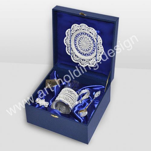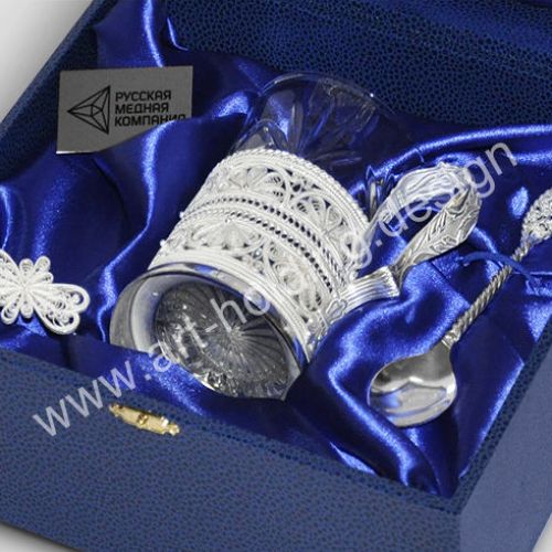 Специально для компании "Русская медная компания", креативная команда "Арт-Холдинг" представила концепцию чайного набора, выполненного в технике - филигрань. Филигрань - это один из древнейших видов художественной обработки металла. В подарочный набор вошли: кружевной подстаканник, салфетница "Ромашка", тарелочка "Циния" и ложка. Набор упакован в подарочную коробку, брендированную шильдом с гравировкой логотипа компании.
