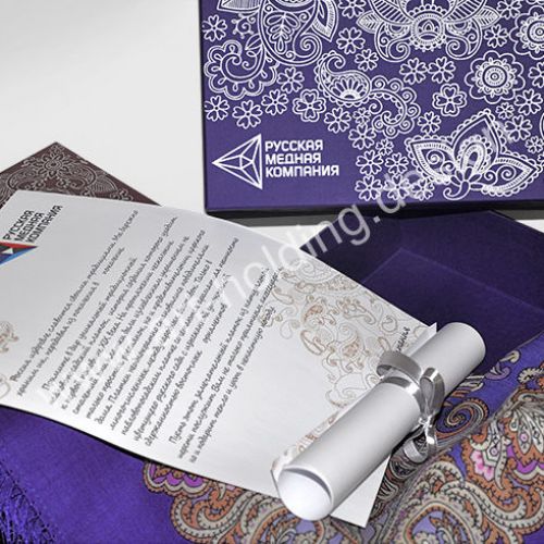 Специально для компании "Русская медная компания" креативная команда "Арт-Холдинг" представила уникальные традиционные павловопосадские платки, история создания которых уходит к первой половине XIX века. На протяжении нескольких столетий эти платки были излюбленным украшением не только простых россиянок, но и представительниц царского дома. Подарки оформлены в замечательные коробки, украшенные утонченным восточным орнаментом и брендированные логотипом компании.